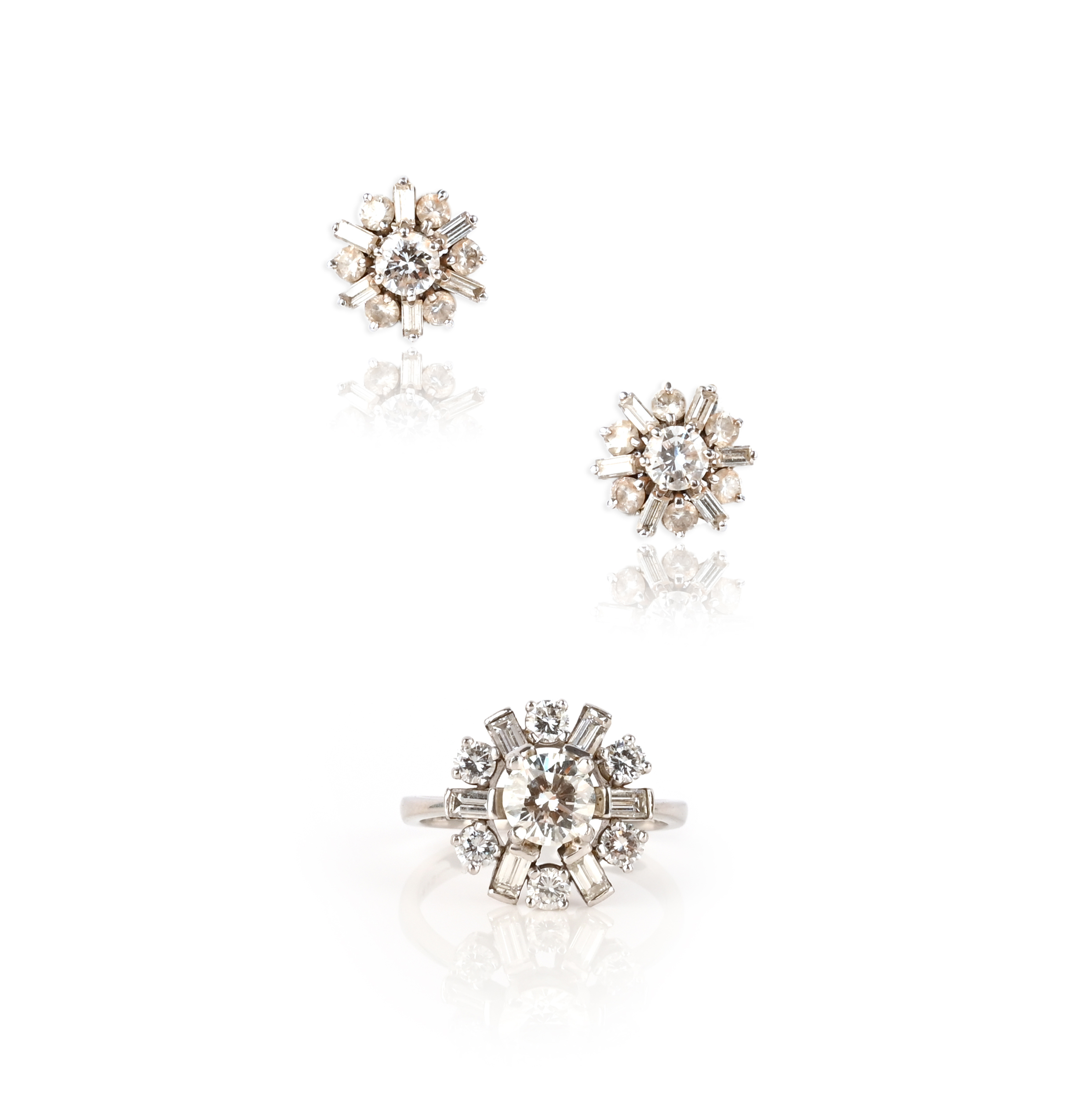 A diamond cluster ring, set with a central round brilliant-cut diamond within a border of baguette-shaped and circular-cut diamonds in platinum, London hallmarks for 2002, size P, with a pair of matching diamond-set earrings, 12mm high, clip fittings