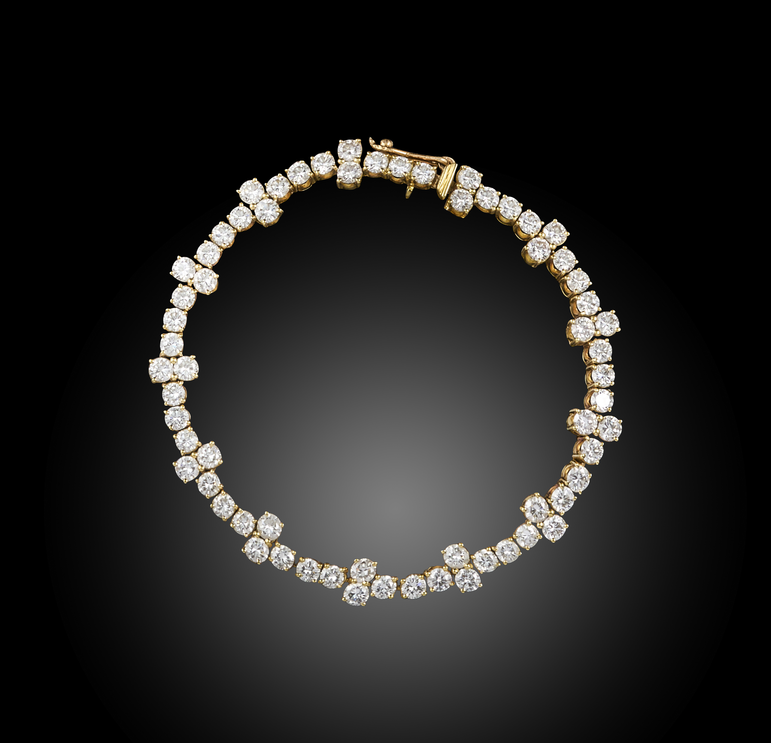 A diamond line bracelet, set with round brilliant-cut diamonds separated with pairs of round brilliant-cut diamonds in yellow gold, 18cm long