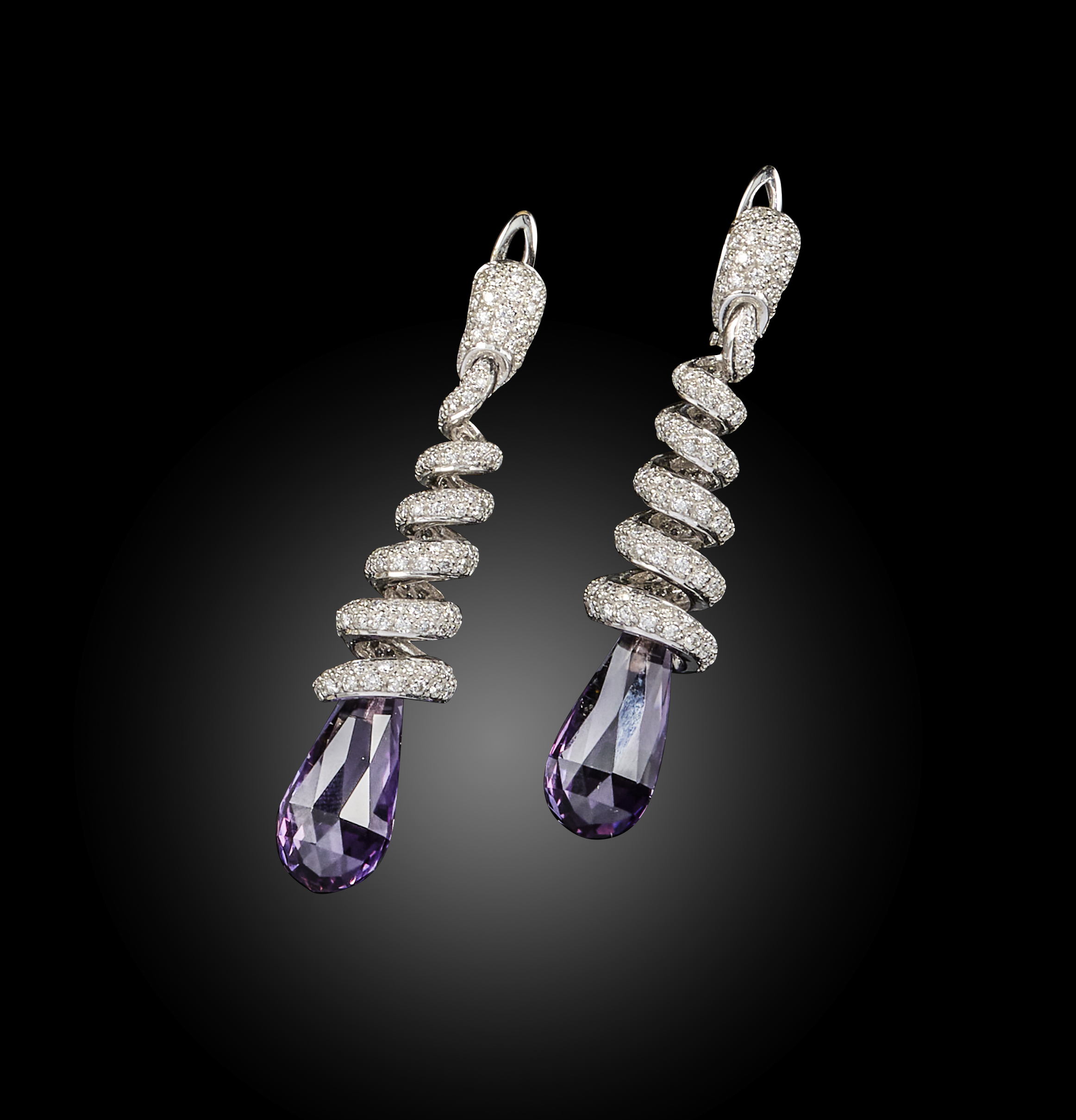 A pair of amethyst and diamond drop earrings, the briolette amethysts suspend from twisted diamond-set mounts in white gold, 5.9cm high