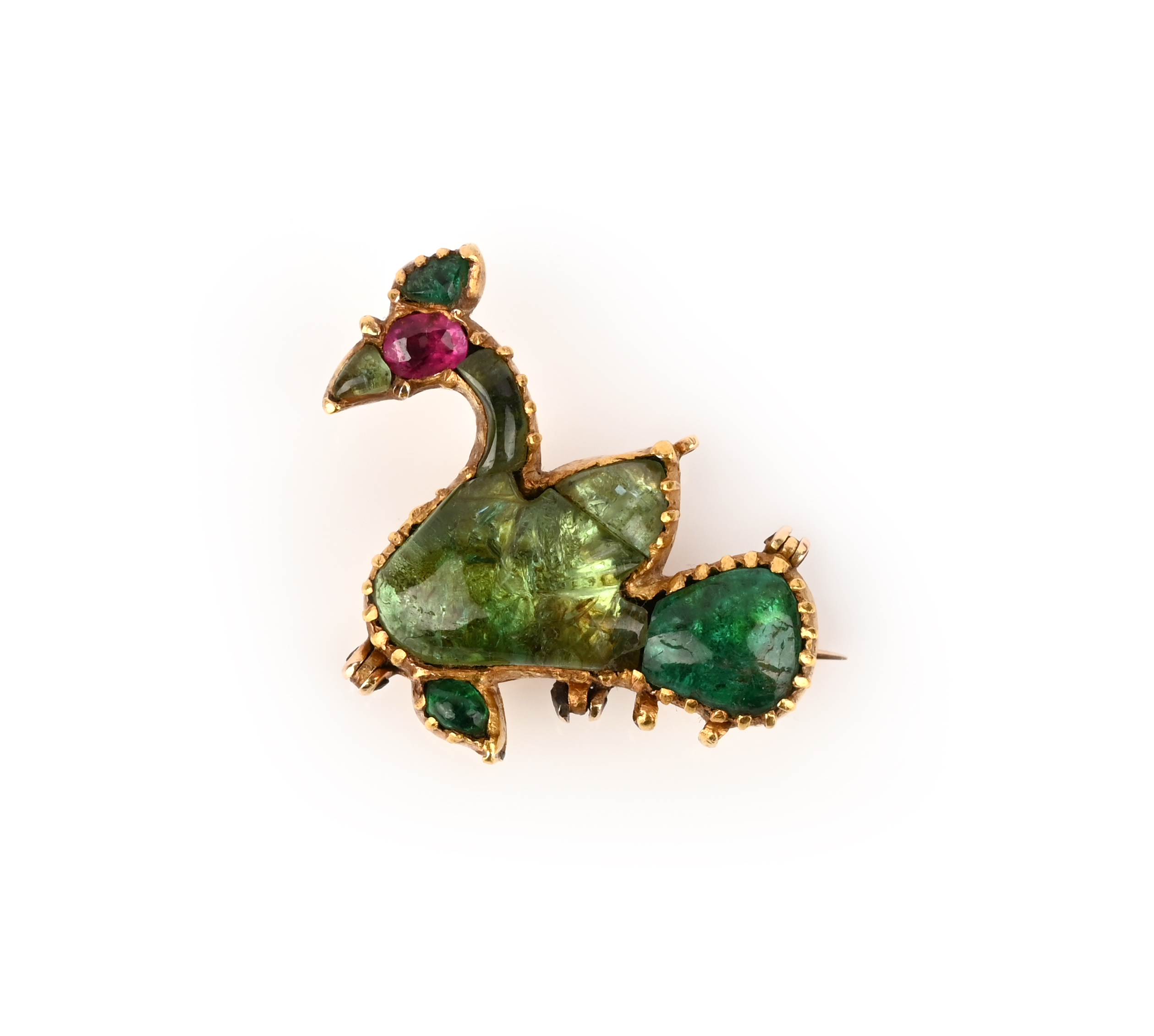 An emerald, ruby and foiled gemstone brooch, India, 19th century, designed as a bird, set with carved emeralds and foil-backed green gemstones, its eye set with an oval ruby, mounted in gold, the reverse with incised decoration depicting a bird, length 3.1cm, later brooch fittings