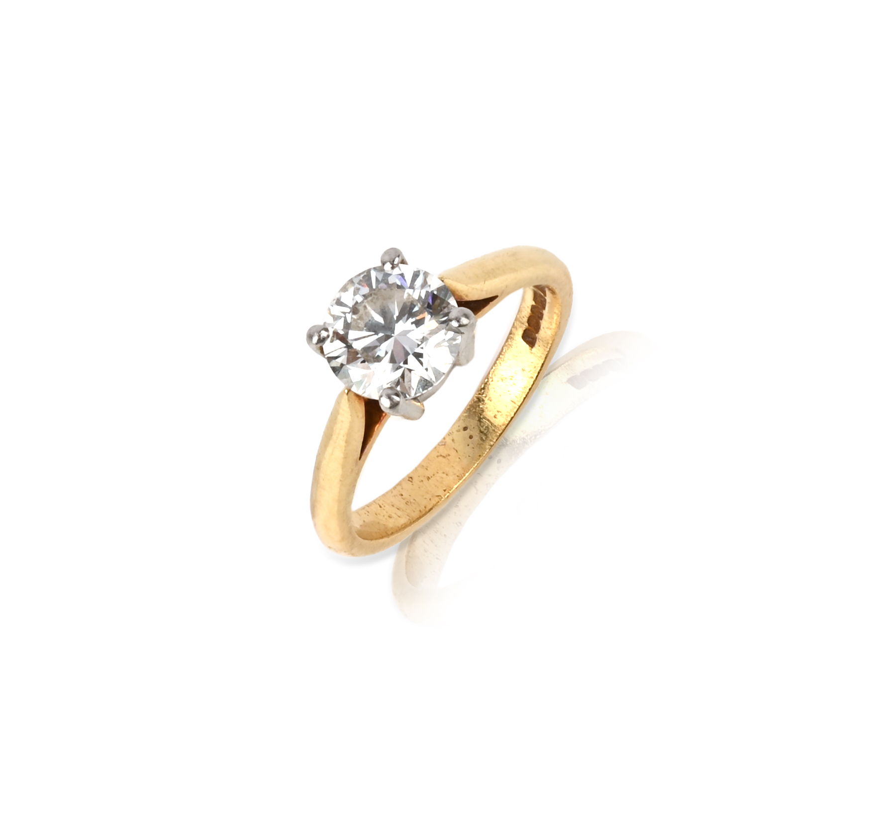 A diamond solitaire ring, the round brilliant-cut diamond weighs 1.52cts, claw-set in 18ct yellow gold, London hallmarks for 2005, size M 1/2