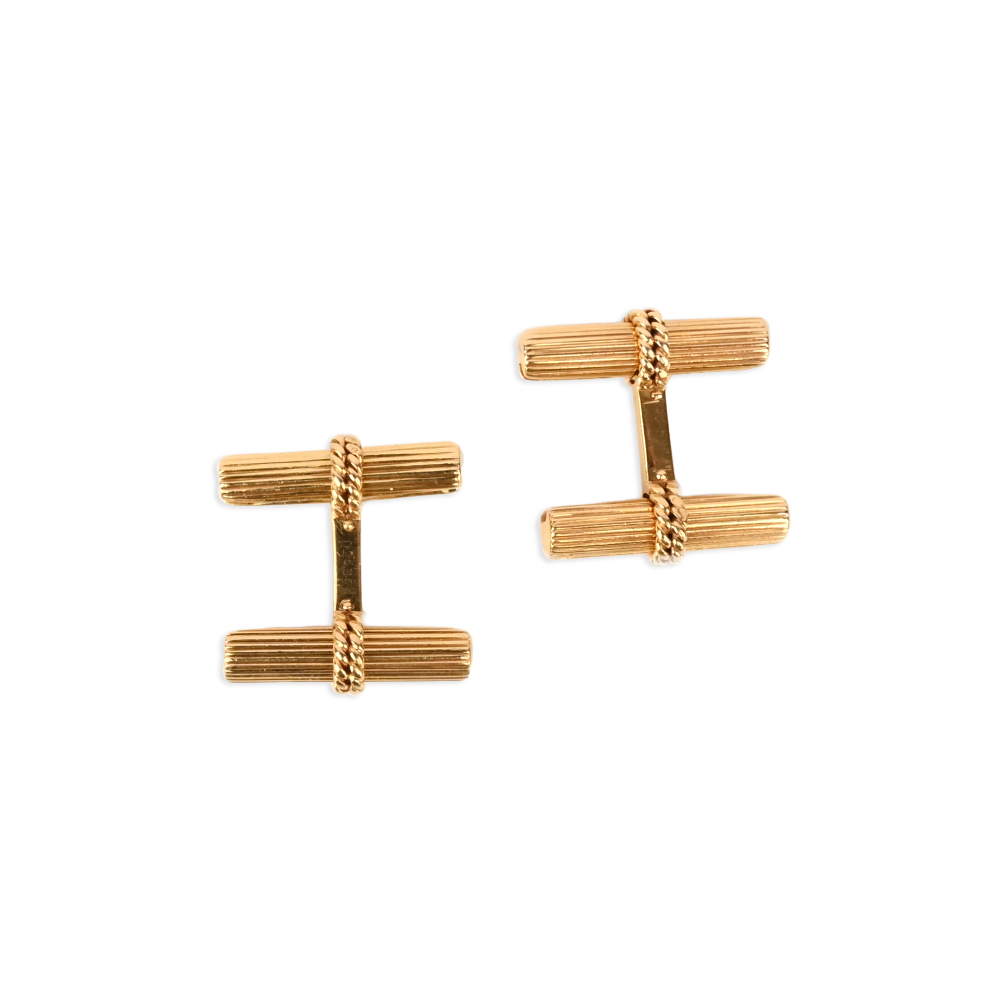 Cartier, a pair of gold baton cufflinks, fluted and tied with gold twisted rope decoration in 18ct yellow gold, signed Cartier Paris and numbered Q2634 and 103524, 2.2cm (baton), Cartier pouch