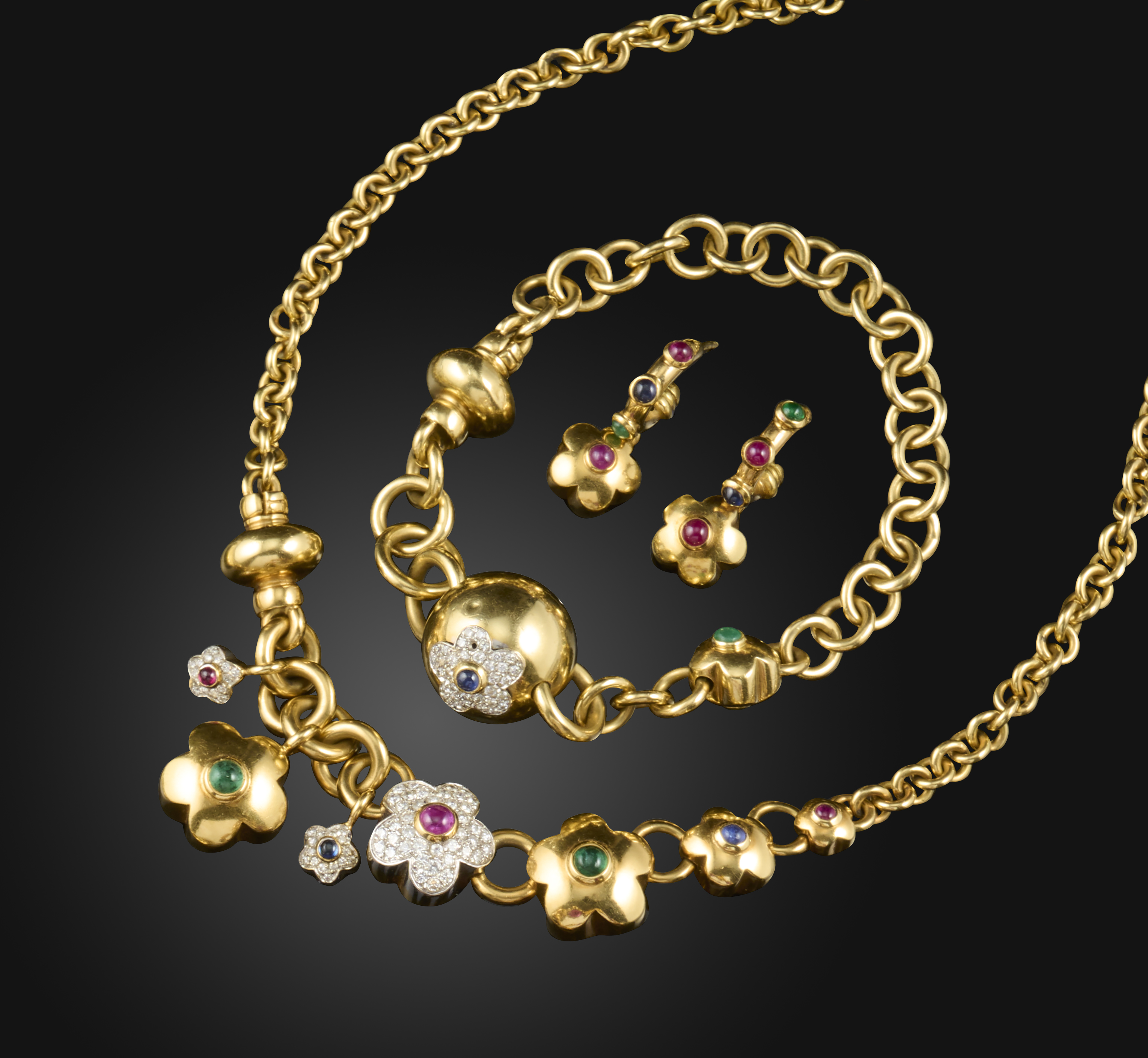 A gold and gem-set parure, comprising: a neckalce, designed as a belcher link chain, the front composed of floral motifs set with brilliant-cut diamonds and cabochon rubies, emeralds and sapphires, length 42cm; a bracelet, length 18.5cm, one diamond deficient; and a pair of earrings of similar design, post fittings, length 2.5cm each