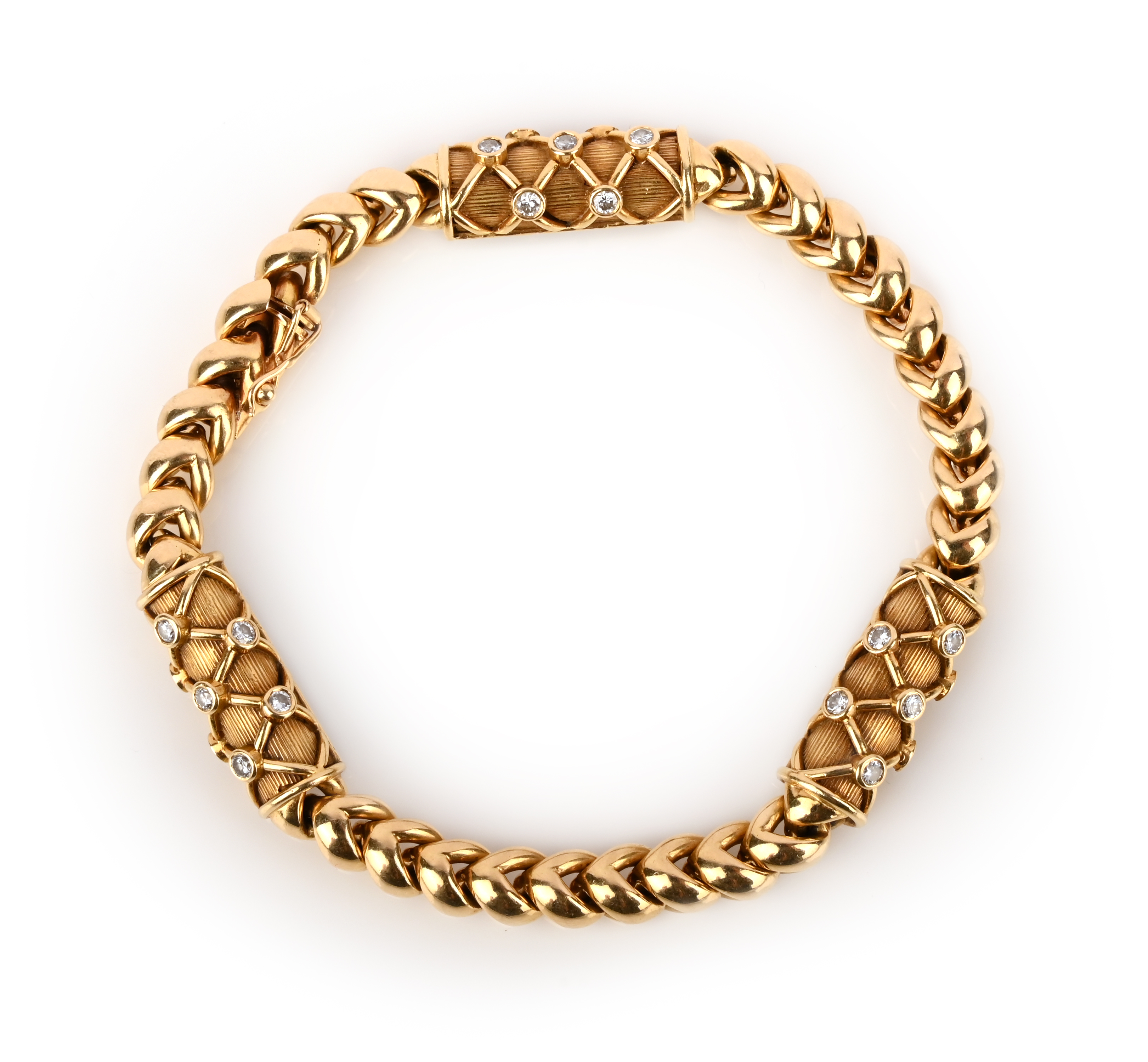 M Gerard, a gold and diamond bracelet, set with three diamond-set latticed plaques within fancy-link yellow gold chain, signed M R Gerard to clasp and numbered SB1049/3, maker's lozenge and French control marks, 19cm long
