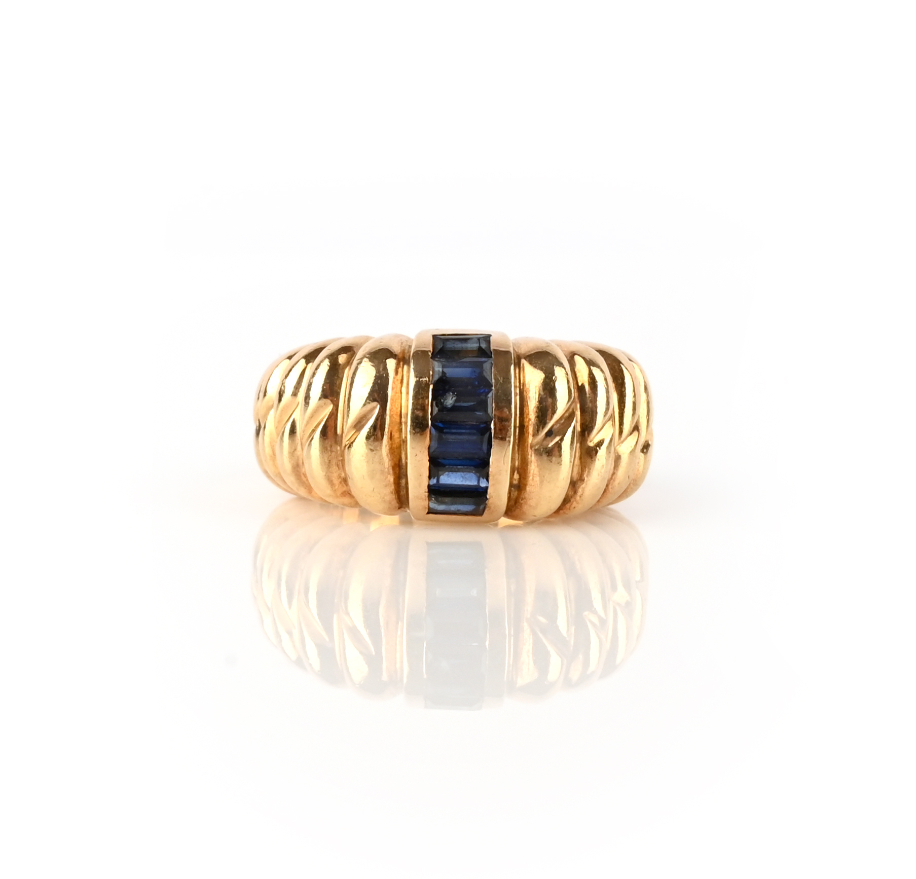 A sapphire-set gold ring, of fluted design set with a central band of channel-set sapphires in yellow gold, size L 1/2