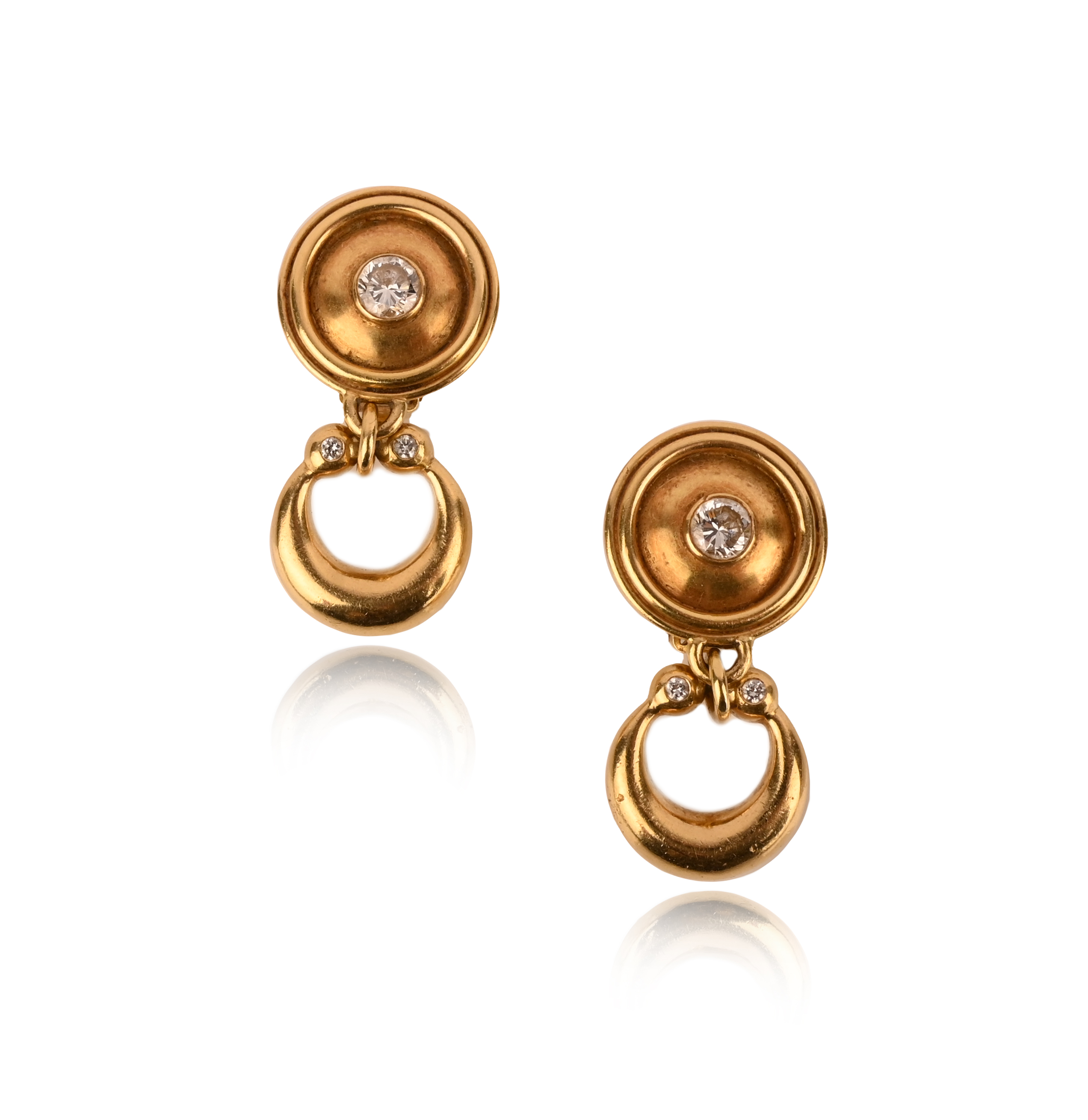 A pair of diamond-set gold stylised door-knocker earrings, set with a central round brilliant-cut diamond within gold disc, suspending a diamond-set pendant in 18ct yellow gold, maker's mark DJH and London hallmarks for 1993, 3.6cm high