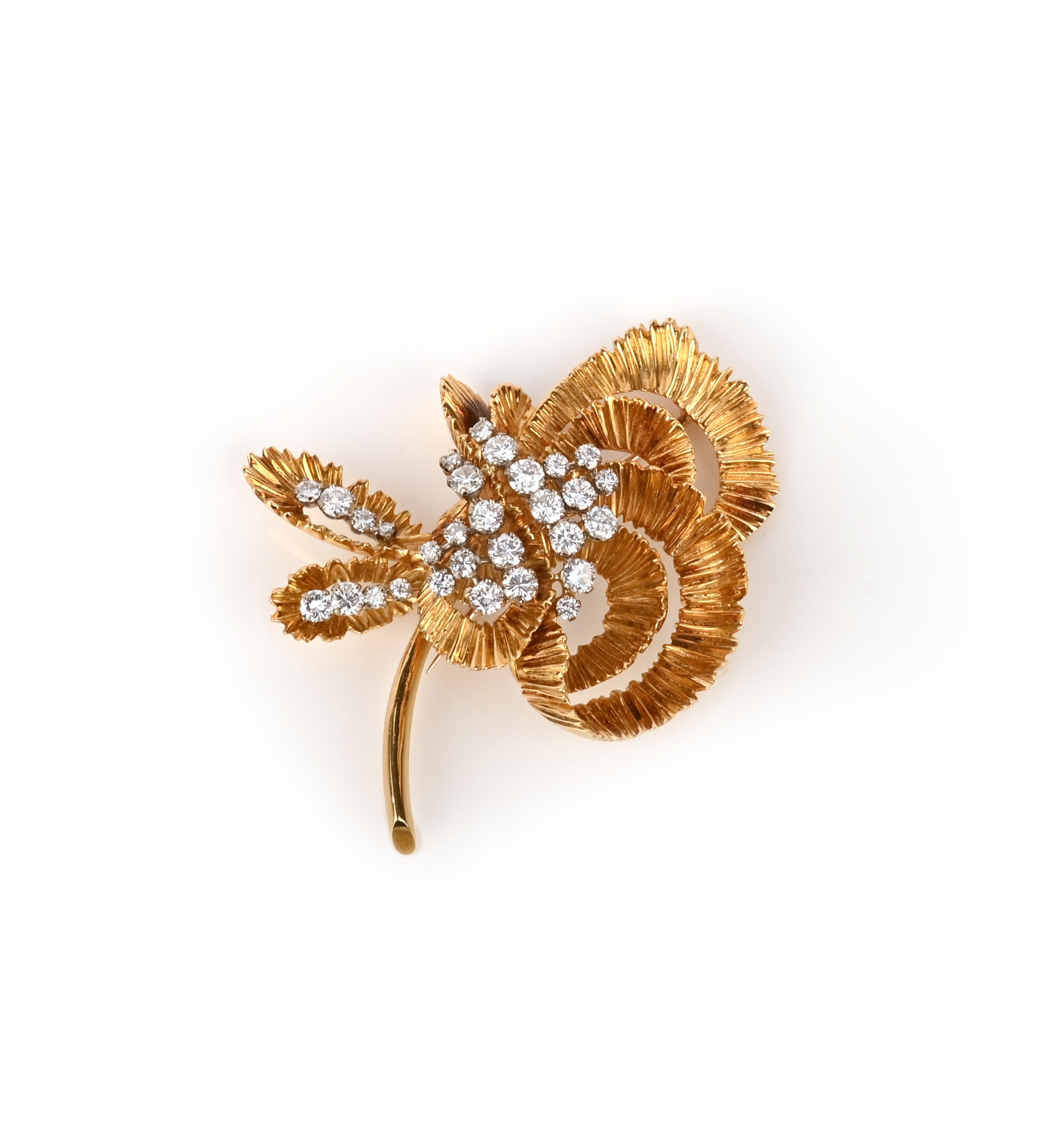 A diamond-set gold flower brooch by Kutchinsky, set with graduated round brilliant-cut diamonds within scrolling 18ct yellow gold, maker's plaque and London hallmarks for 1968, 6cm high