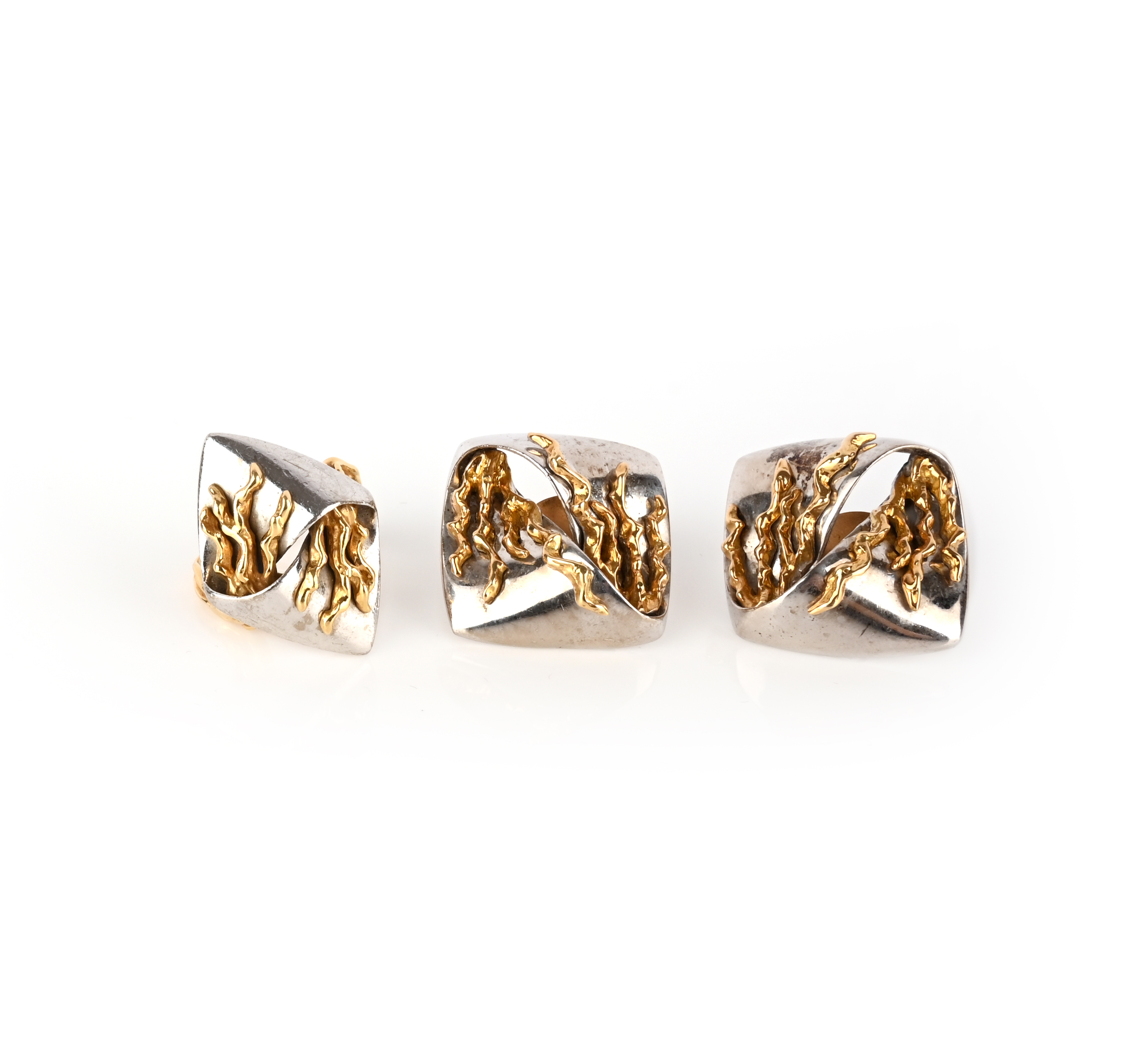 Kutchinsky, a gold demi-parure, 1971, comprising: a pair of earrings, designed as a rhomboid Mobius strip with abstract textured branches in bicoloured 18ct gold, length 3.2cm each, post fittings, each with maker's mark for Kutchinsky, British hallmarks; and a ring of matching design with a shank modelled as a gnarled wooden branch, size O, attributed to Kutchinsky, unsigned