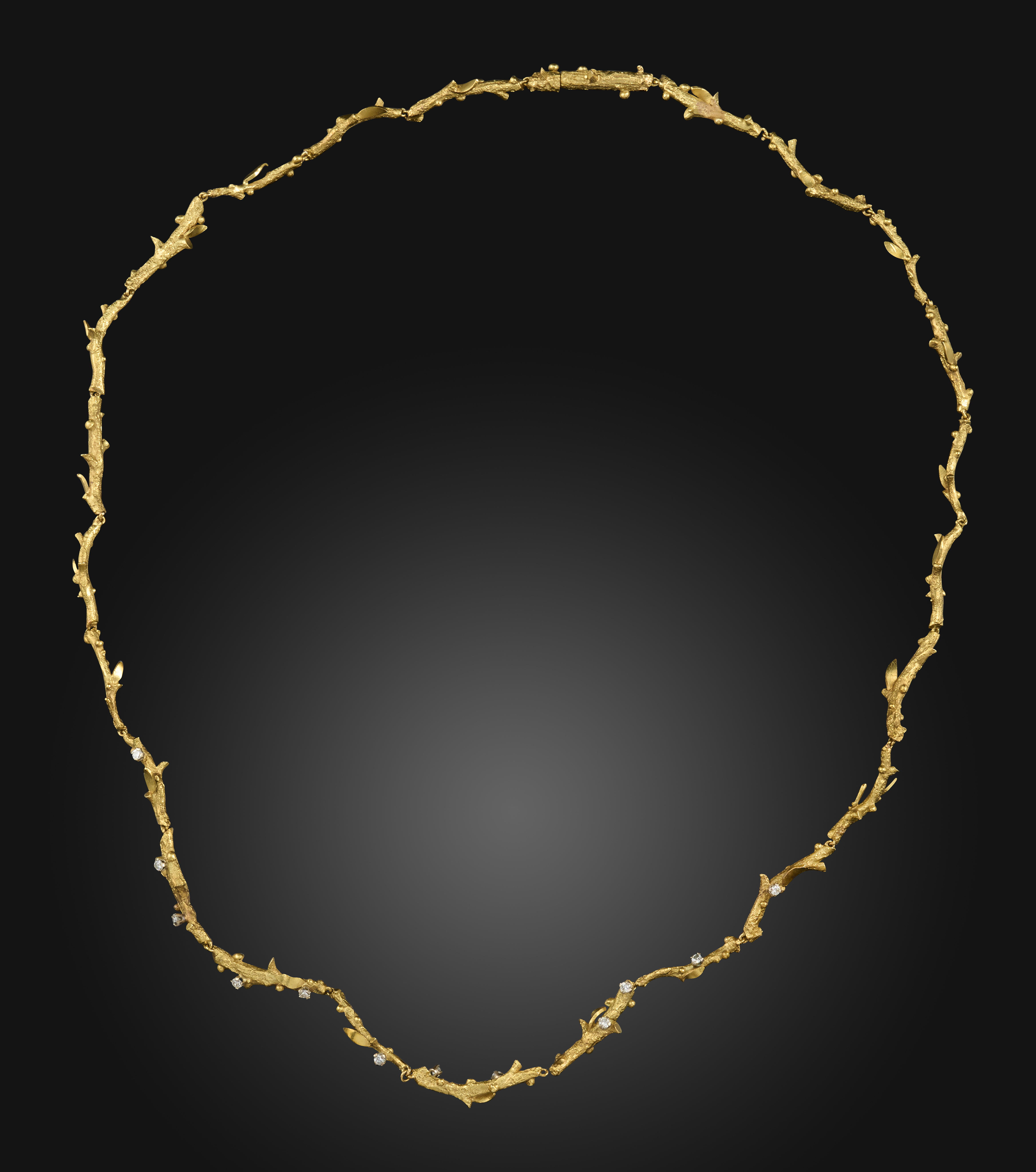 A gold and diamond necklace, 1970s, composed of branches in textured gold, set with brilliant-cut diamonds, length 58cm