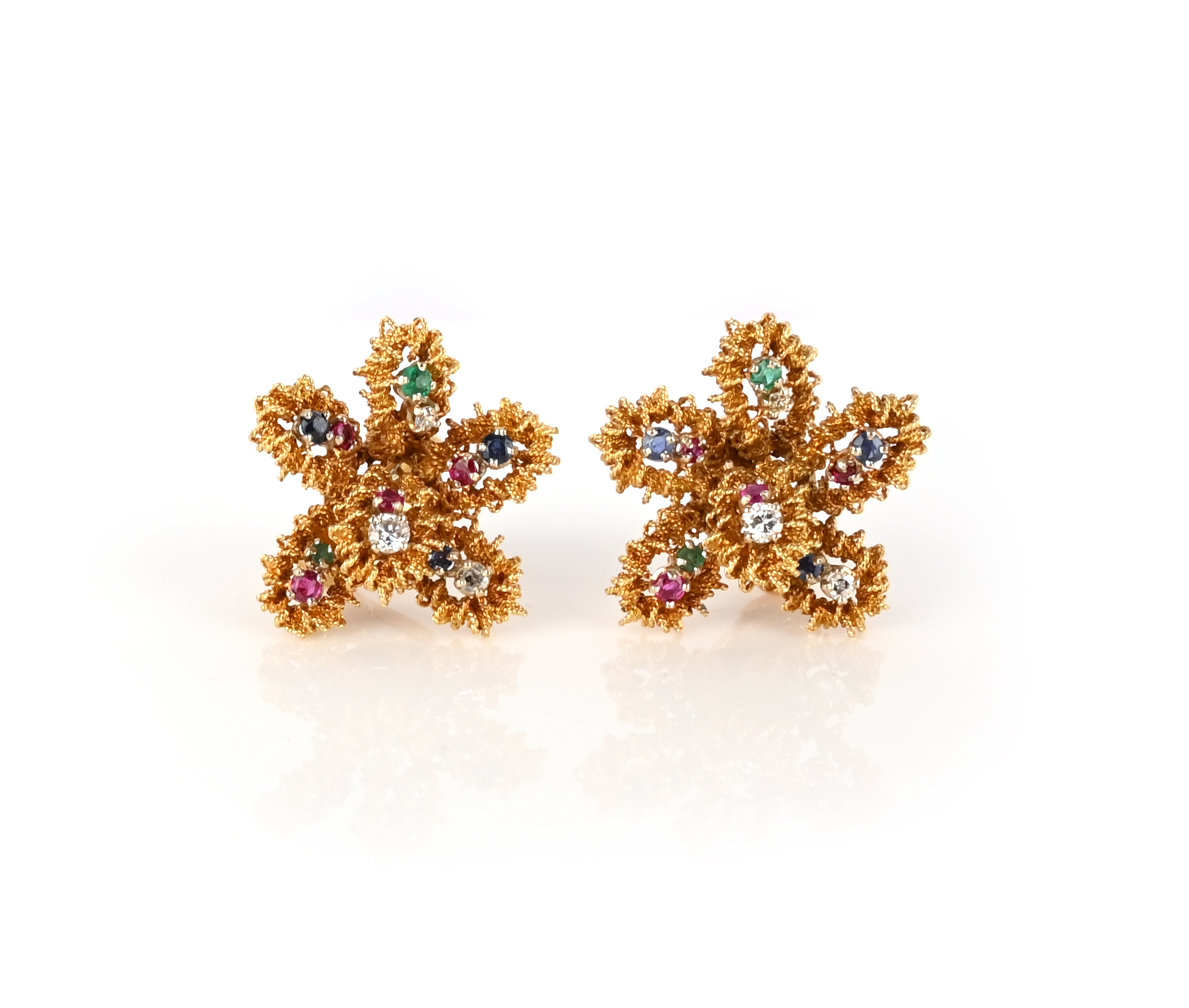 A pair of French gem-set gold earrings, set with rubies, sapphires, emeralds and diamonds within gold twisted rope surround, clip fittings, 2.7cm high