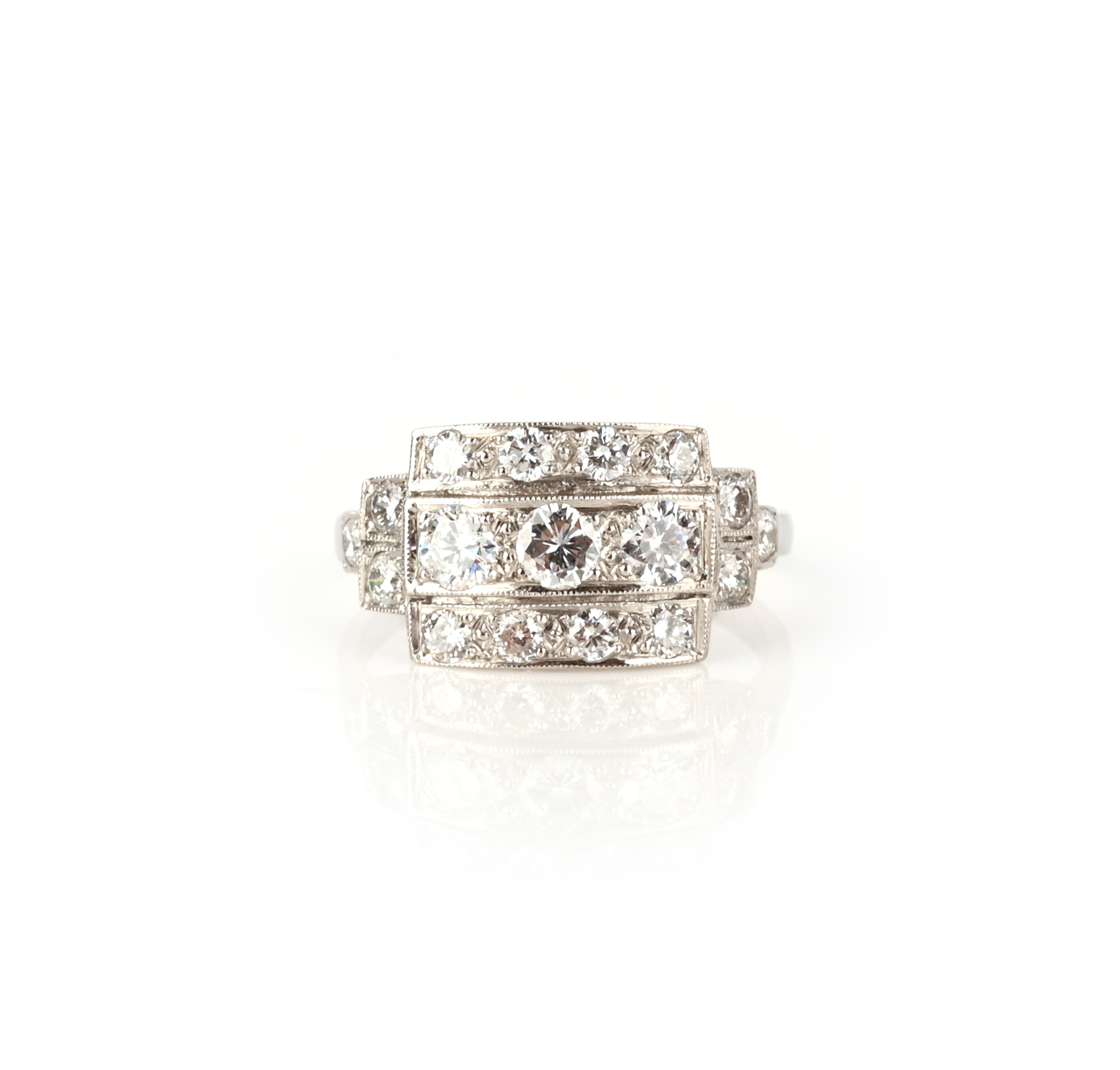 A diamond cluster ring, of rectangular form, set with graduated round brilliant-cut diamonds in platinum, size Q