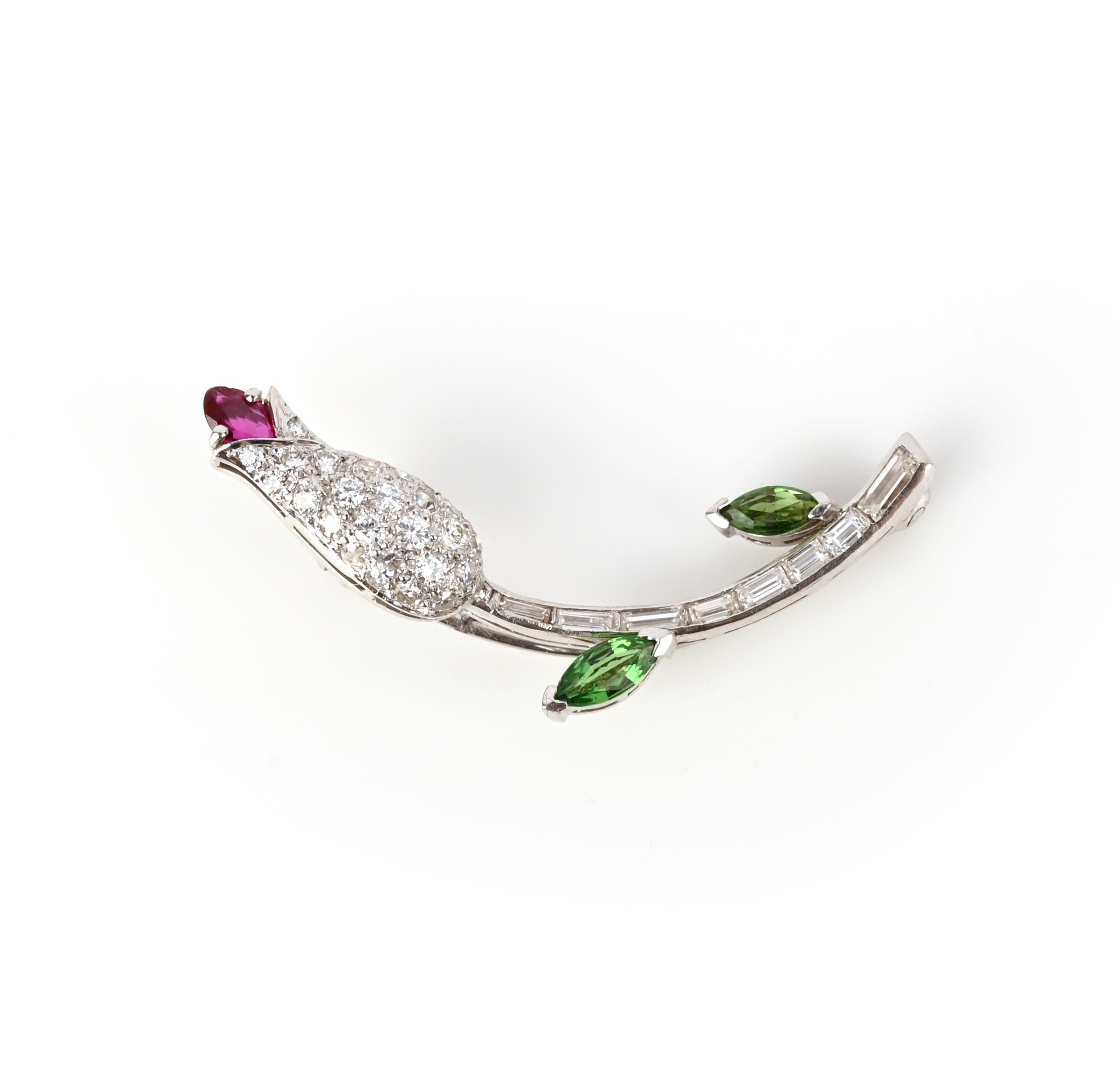 A tsavorite, ruby and diamond brooch, designed as a rosebud, the rosebud and stem set with brilliant-cut and baguette diamonds, the leaves set with marquise-shaped tsavorite garnets, the rosebud tipped with a marquise-shaped ruby, mounted in white gold, length 3.8cm