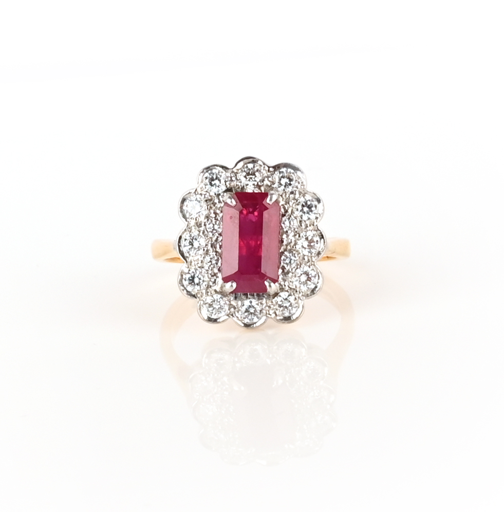 A ruby and diamond cluster ring, claw-set with a step-cut ruby within a border of brilliant-cut diamonds, size P, British hallmarks for 18ct gold