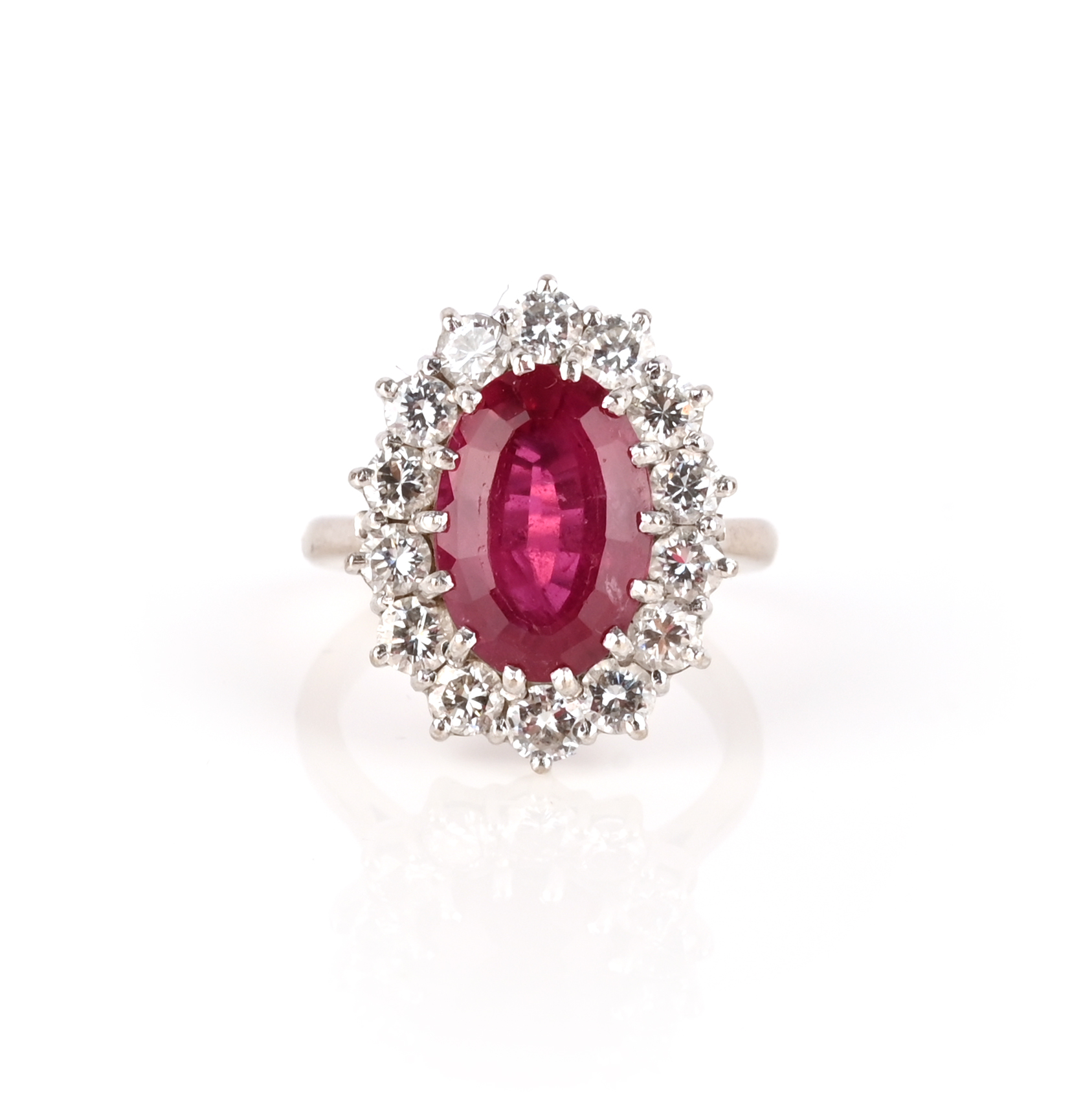 A tourmaline and diamond cluster ring, the oval tourmaline set within a surround of round brilliant-cut diamonds in white gold, size L