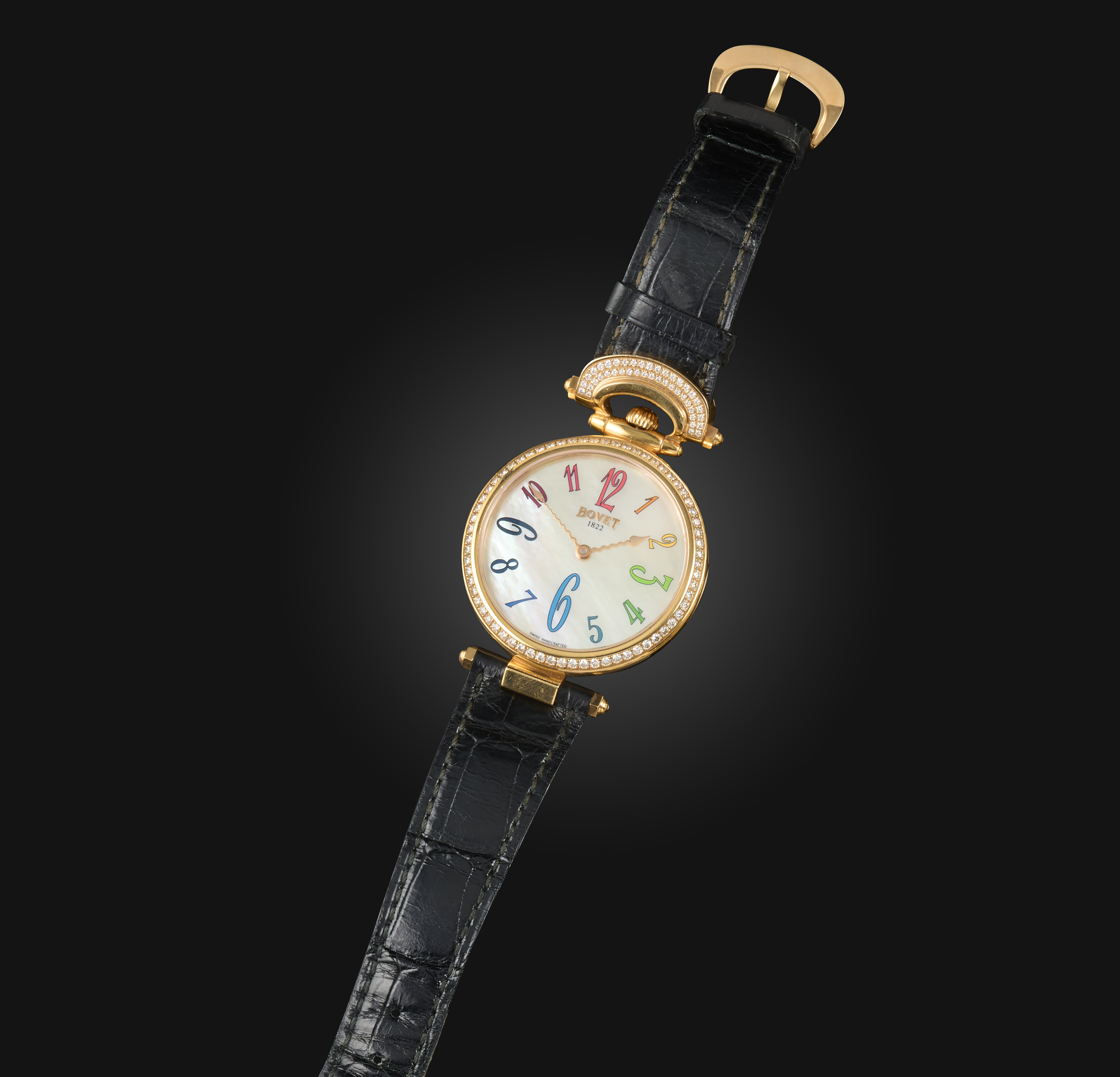 Bovet, a mother of pearl, gold and diamond wriswatch, 'Collection Château de Môtiers', the circular dial in mother of pearl, the hour indicators in multicoloured enamel, with gold hands, the bezel and one lug set with brilliant-cut diamonds, to a black leather strap, mounted in yellow gold, dial 3.3cm, automatic movement, dial case back and buckle signed Bovet, case back stamped 750 and 18K, numbered G800 and 019384