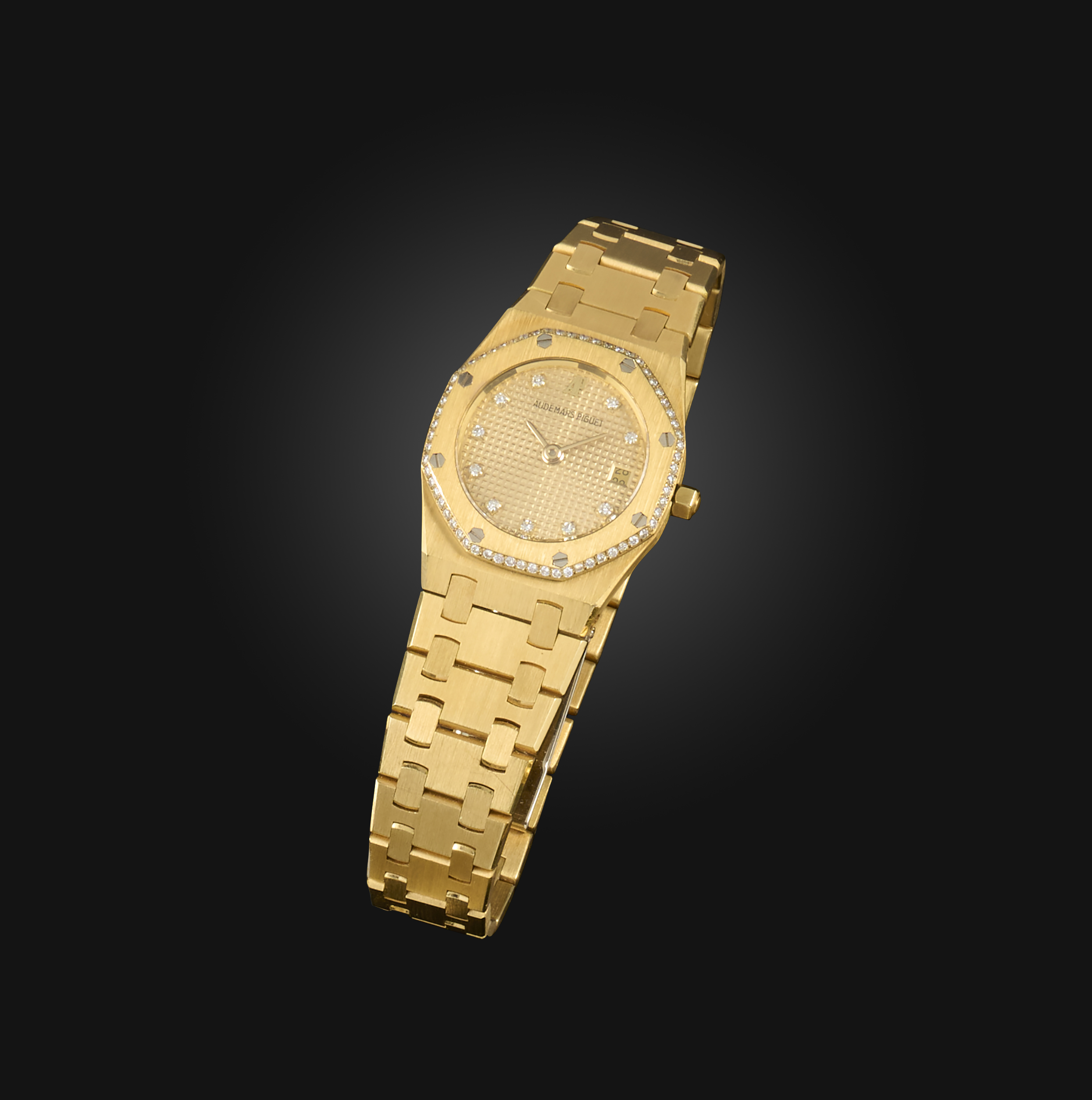 Audemars Piguet, a lady's 18ct gold and diamond wristwatch, 'Royal Oak', the gold face with a square grid design, with gold hands, diamond indicators and date wheel aperture, within an octagonal bezel with screw motifs and bordered with brilliant-cut diamonds, to a gold link bracelet with deployant clasp, dial 1.7mm diameter, inner circumference 16cm, quartz movement, signed Audemars Piguet, inscribed Royal Oak, No443, European convention marks for 18ct gold, fitted case stamped Audemars Piguet