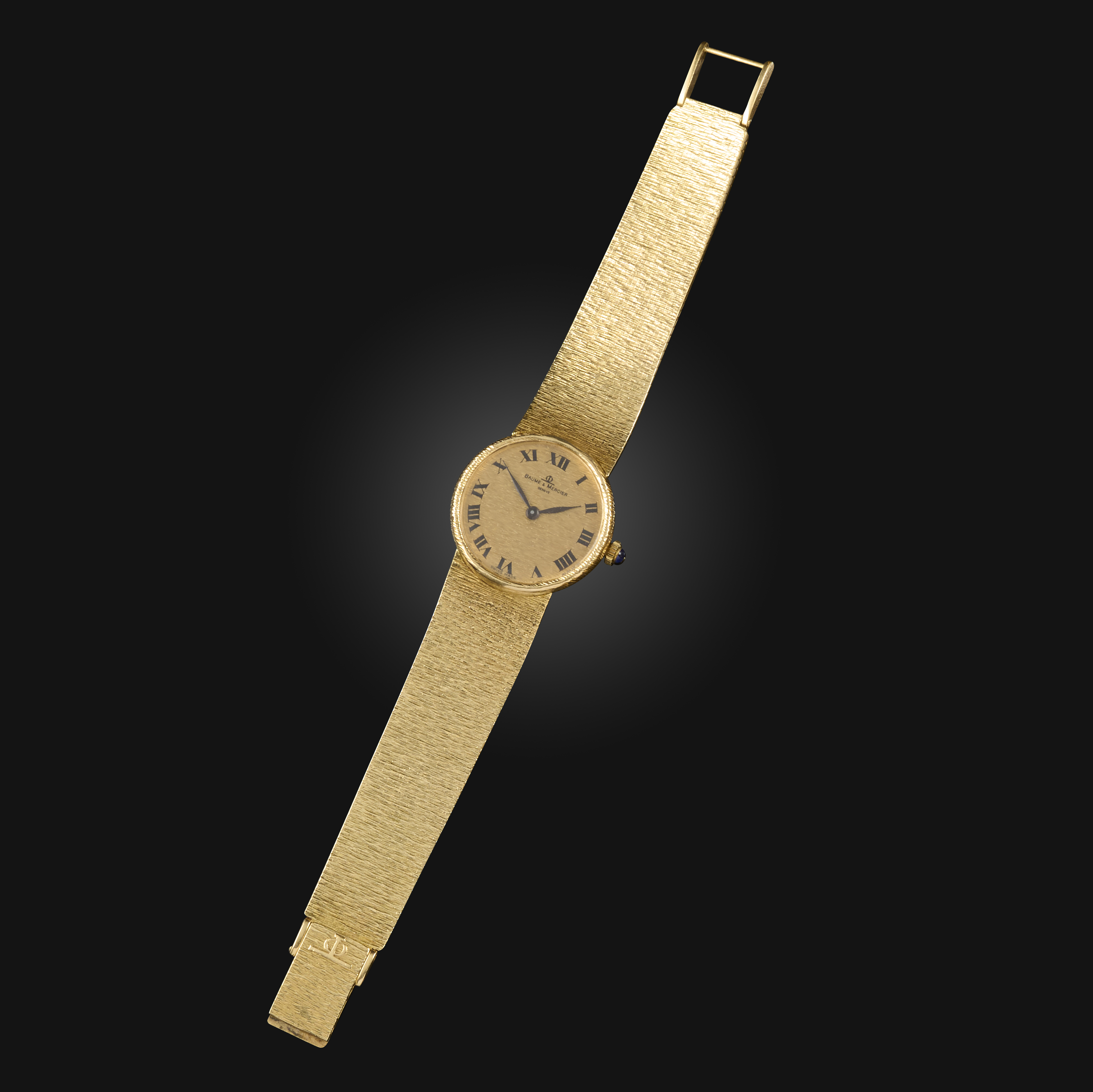 Baume & Mercier, a lady's 18ct gold wristwatch, the textured gold dial with black Roman numeral indicators and blackened steel hands, to an integrated link bracelet, dial 2.1cm diameter, bracelet length 14.7cm, manual winding movement, signed Baume & Mercier, case back numbered 747033 and 36653, Swiss and European convention marks for 18ct gold