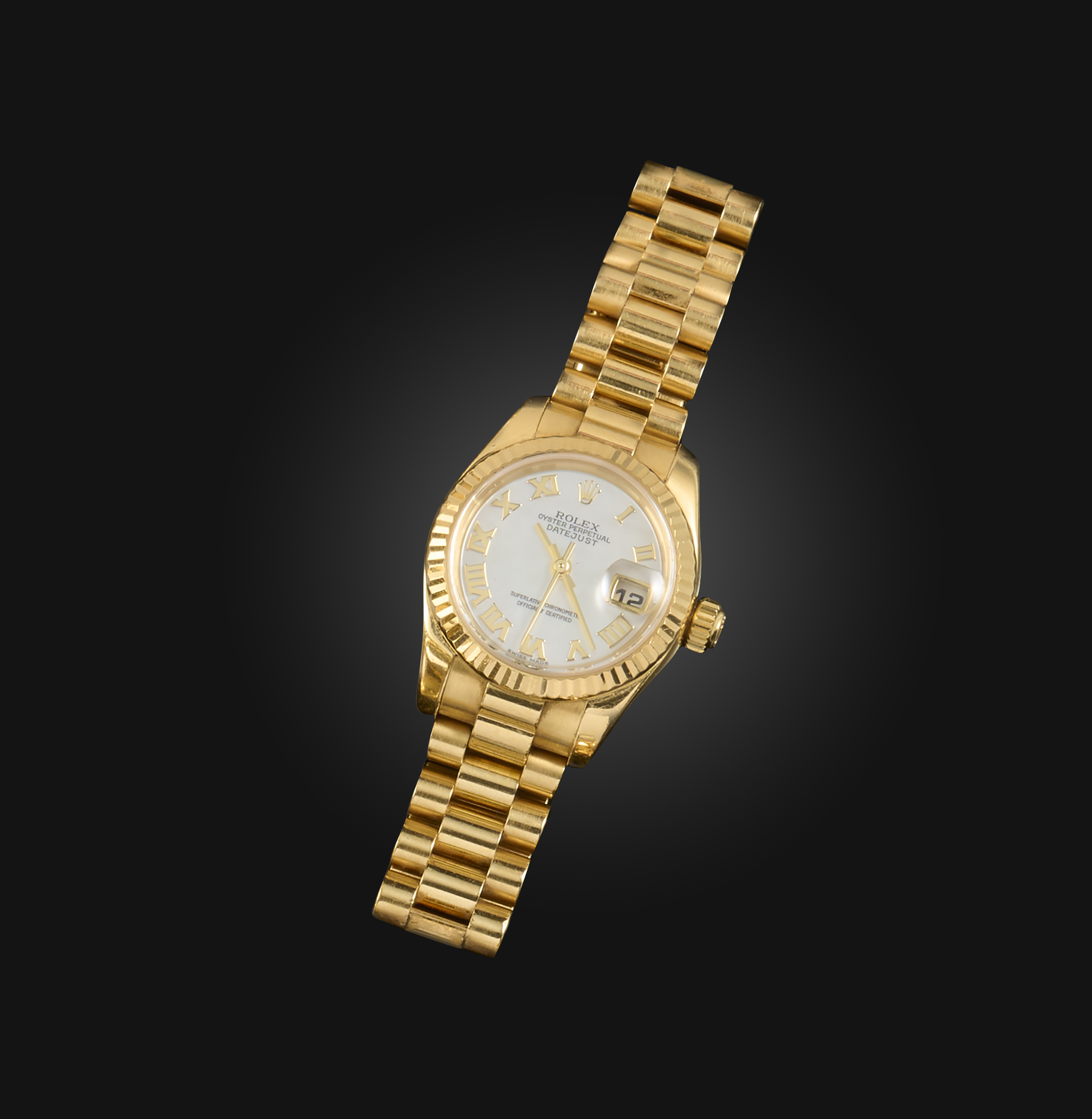 Rolex, a lady's gold DateJust wristwatch, signed mother of pearl dial with Roman numerals and date aperture, sweep seconds hand, oyster perpetual automatic movement, on president-link bracelet, case 2.7cm wide, numbered K830536 and 179178, original box and papers
