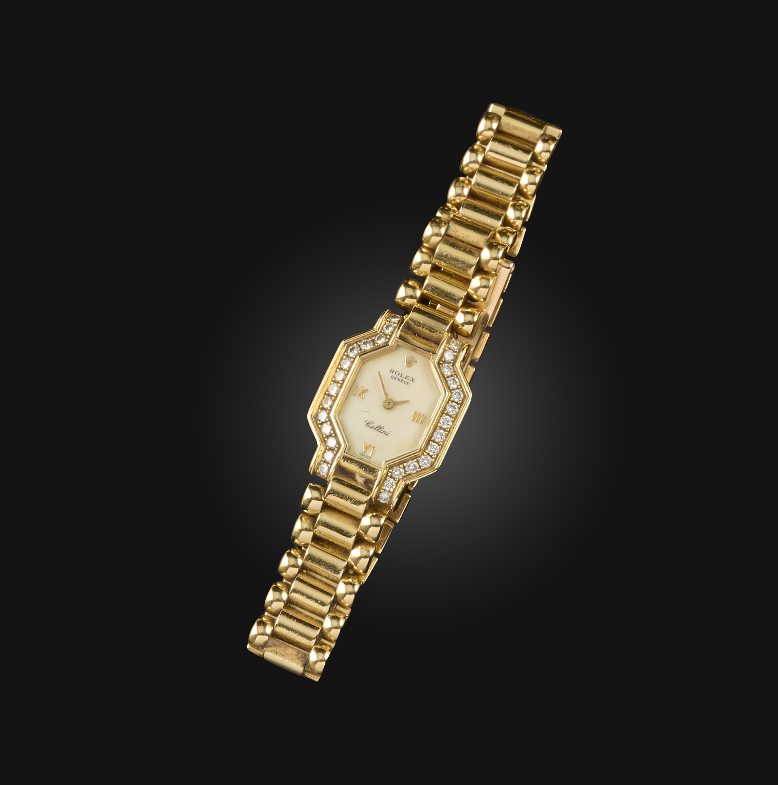 Rolex, a lady's 18ct gold, mother of pearl and diamond wristwatch, 'Cellini', circa 1992, the octagonal mothe rof pearl dial with gold hands and indicators, within a geometric bezel set with brilliant-cut diamonds, to an integrated gold strap with deployant clasp, dial 1.7 x 1.4cm, signed Rolex Cellini, Swiss and European convention assay marks for 18ct gold, inner circumference 17.5cm, original box and papers, ref no. E465319, dated 1992, central watch holder deficient