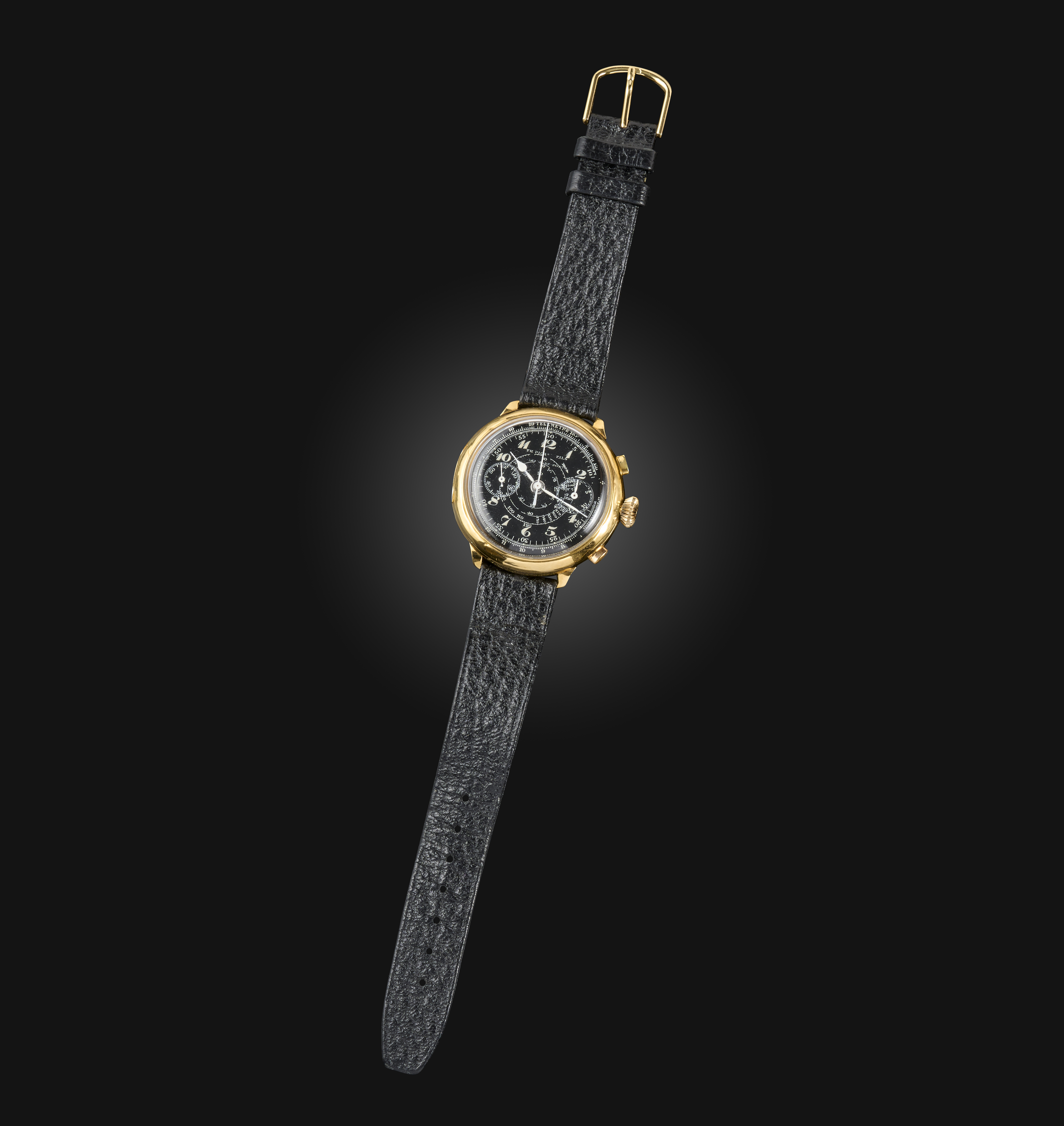 TH Picard et Fils, a gold chronometer wristwatch, 'La Chaux-de-Fonds', mid 20th century, the black enamelled dial with subsidiary seconds and half hour dials, with white enamelled hands, to a gold case with winder and two buttons for stopwatch function, to a later black leather strap, dial 3.2cm diameter, manual winding movement, dial signed TH Picard et Fils, La Chaux-de-Fonds', the top inscibed 'Telemetre' case and interior of case back with Swiss assay marks for 18ct gold, numbered 224403