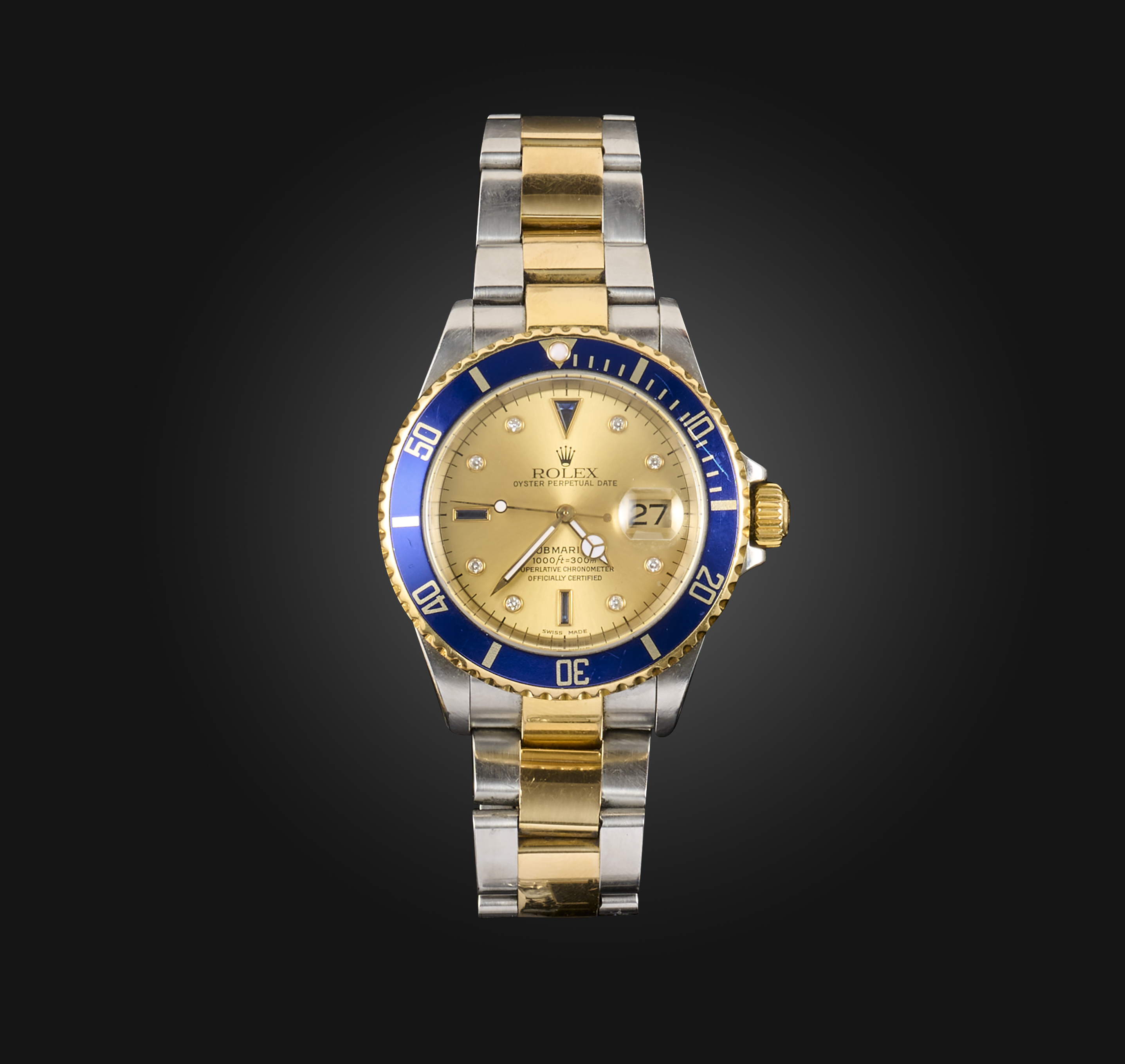 Rolex, a gentleman's stainless steel and diamond wristwatch, 'Submariner', circa 2004, the brushed gilt dial with date wheel aperture and sapphire and diamond indicators, the hands applied with luminescent paint, within a blue enamel bezel, to a bicoloured stainless steel strap with adjustable deployant clasp, dial diameter 2.9cm, model no. 16613, reference no. Y425785, original box and papers