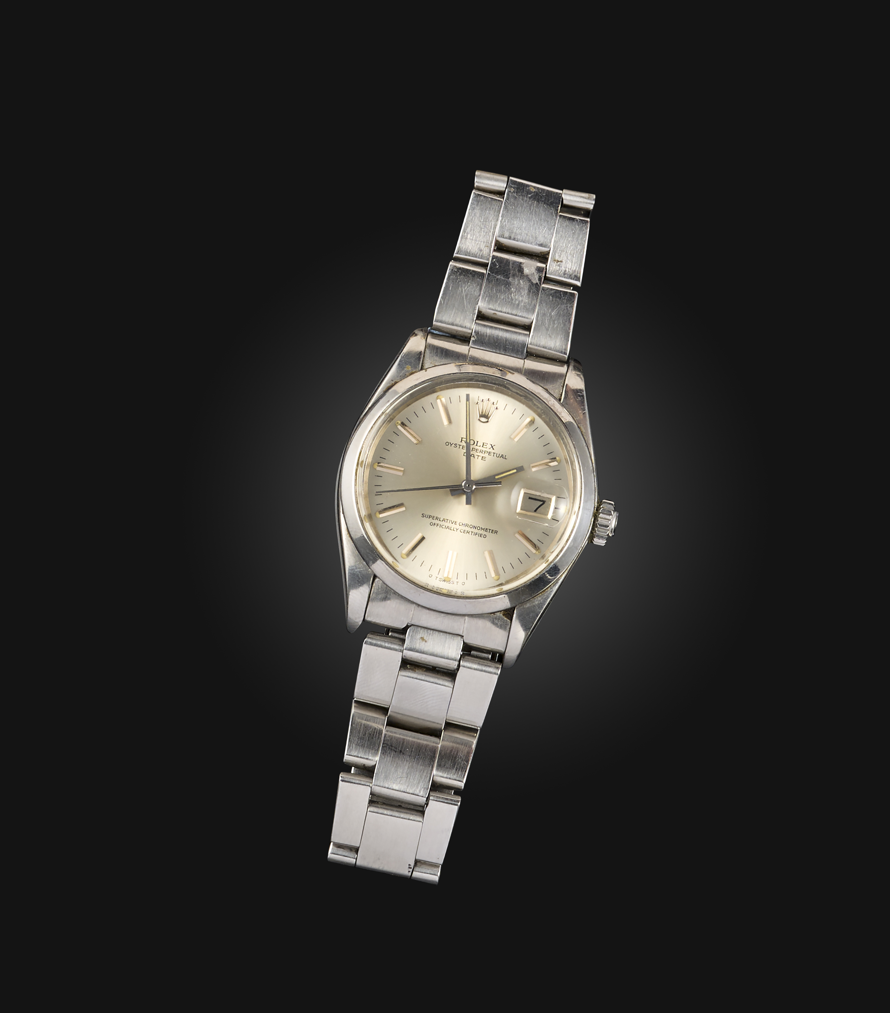 Rolex, a gentleman's stainless steel, 'Oyster Perpetual Date', the silvered dial with baton indicators, steel hands and date wheel aperture, to a plain stainless steel bezel and link bracelet with deployant clasp, dial 2.9cm, automatic movement, ref no. 1500, case no. 5123541