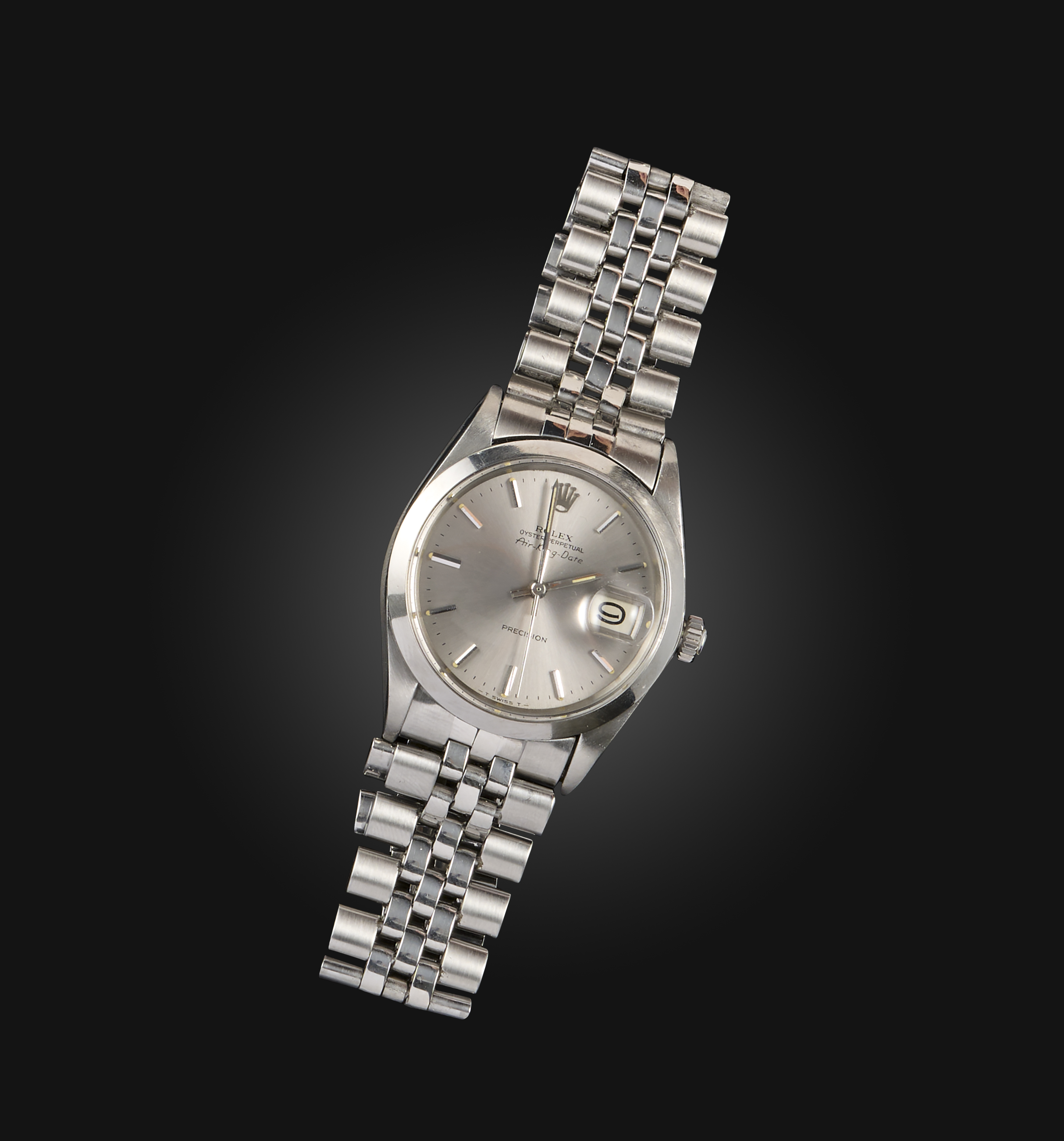 Rolex, a gentleman's stainless steel 'Air King Date' wristwatch, circa 1972, the silvered dial with baton indicators and steel hands with date wheel aperture, to a steel link bracelet, dial 2.8cm diameter, automatic movement, model no. 5700, serial no. 27865634, pouch, papers and Rolex service certificate