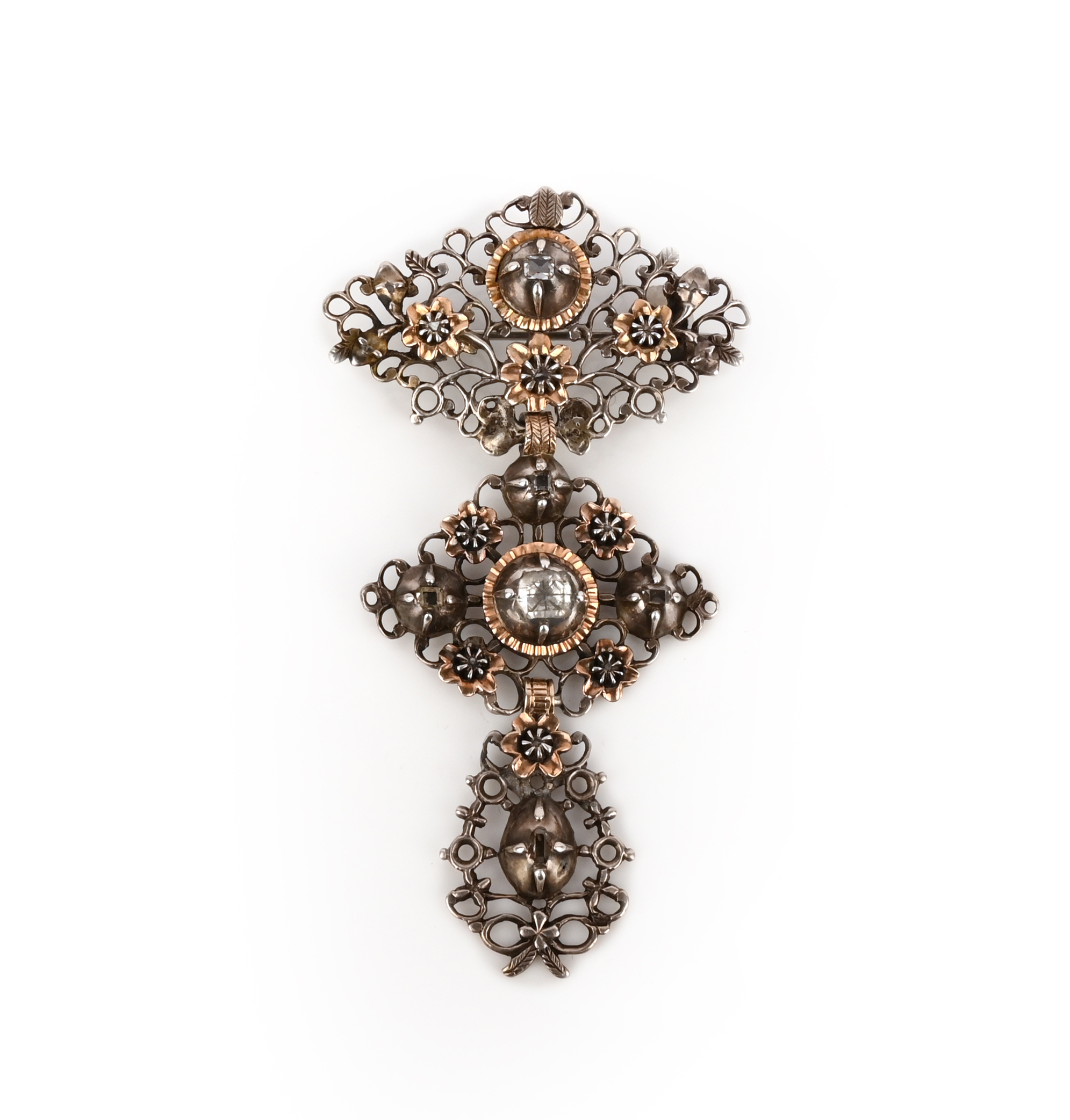 A diamond brooch, late 18th century, composed of three vertically arranged panels of floral scrollwork, set with rose-cut diamonds in foil-backed collet settings, mounted in silver, length 7.1cm, later brooch fitting, case