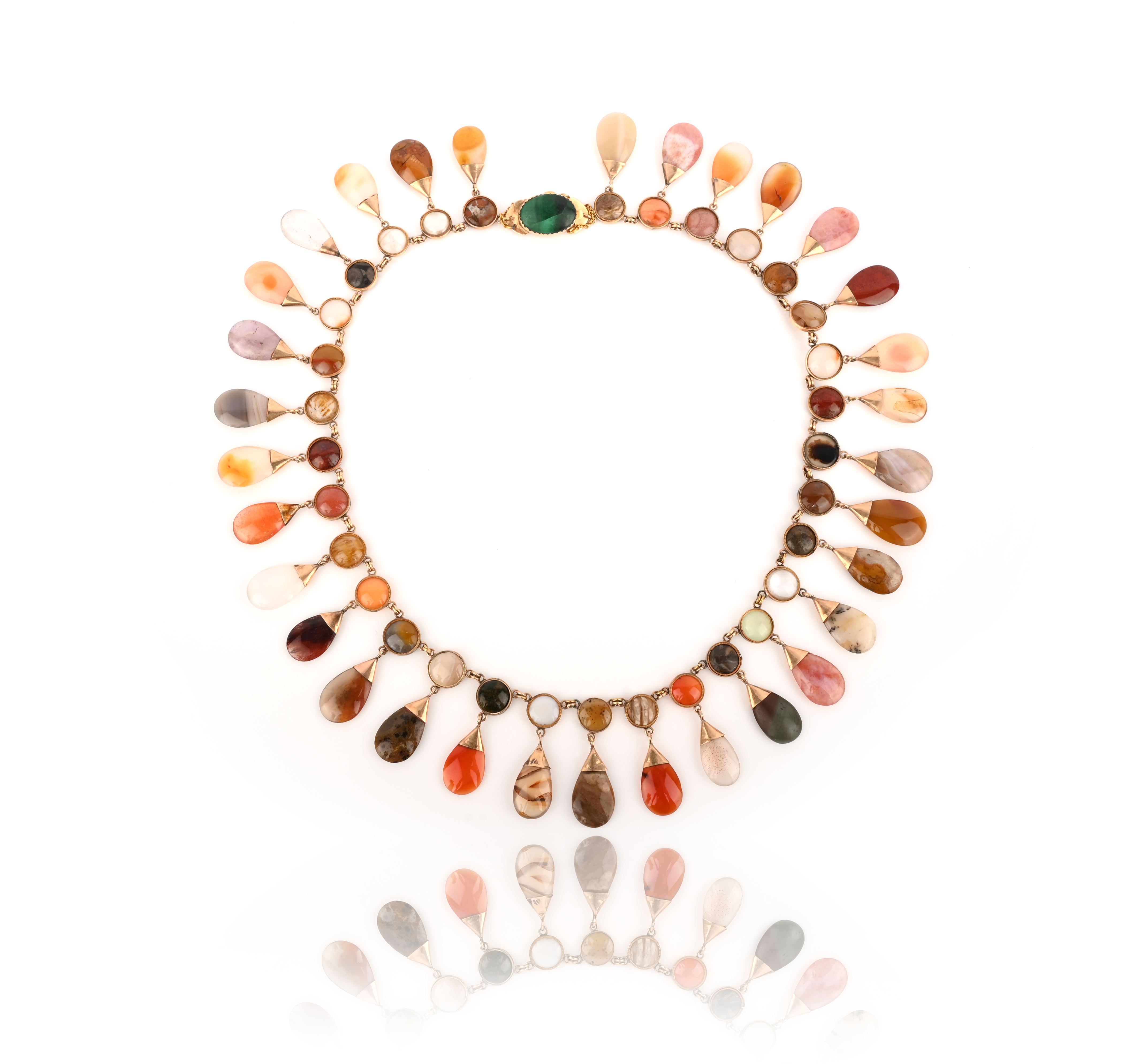 A rare George III hardstone necklace, late 18th/early 19th century, designed as a sequence of collet-set hardstone cabochons suspending various hardstone drops, including rock crystal, amethyst, jasper, chalcedony and agate, to a malachite clasp, length 40cm