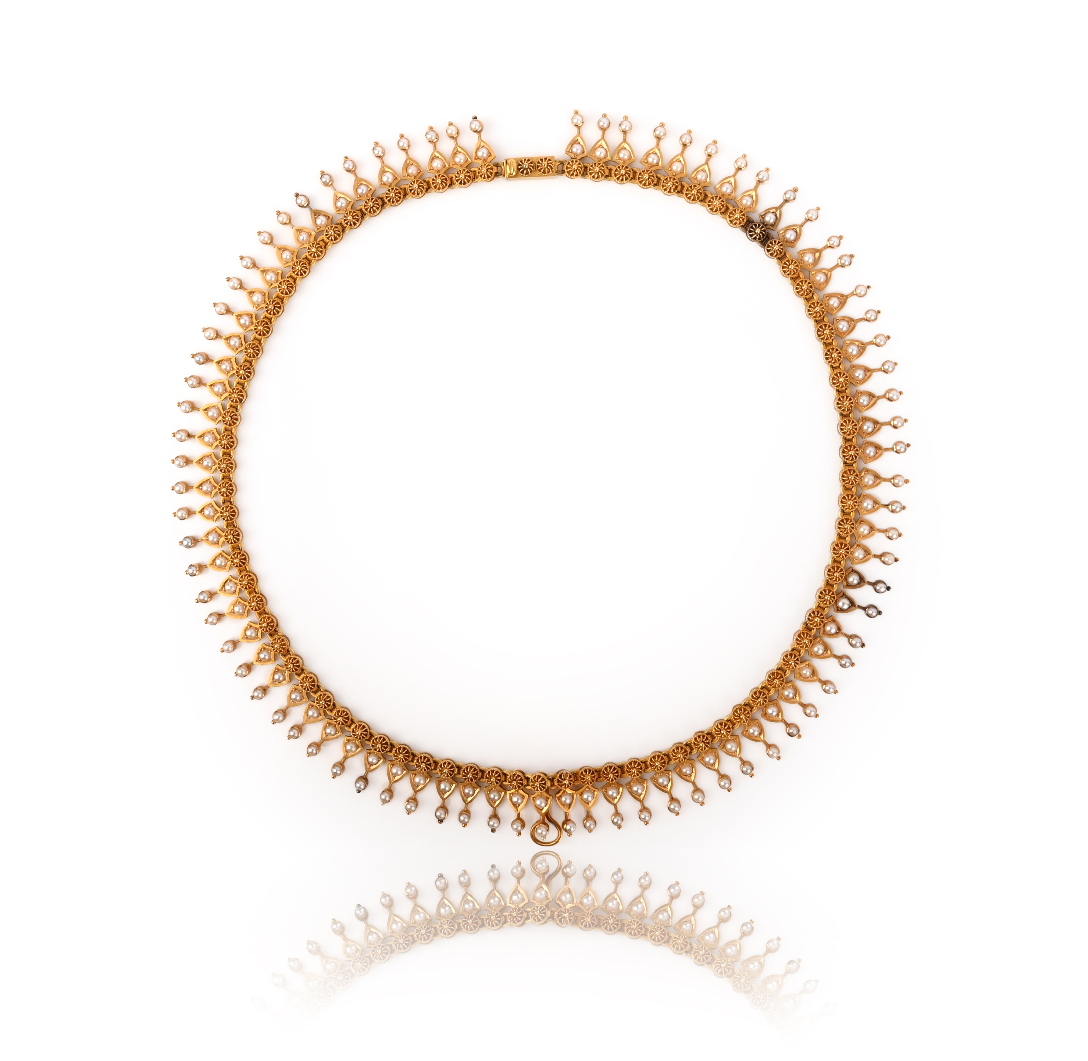 A Victorian pearl-set gold collar necklace, the fringe formed from small cannetille discs each suspending two seed pearls in yellow gold, the centre with a suspension loop, 42cm long, case by Hunt & Roskell