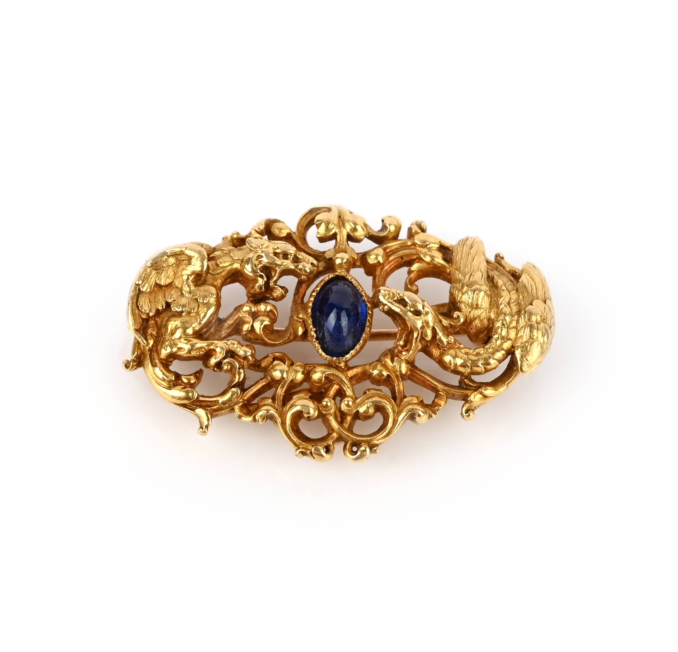 A late 19th century sapphire brooch, the stylised griffin and winged serpent fighting over a cabochon sapphire, within pierced scrolling yellow gold surround, 4cm wide