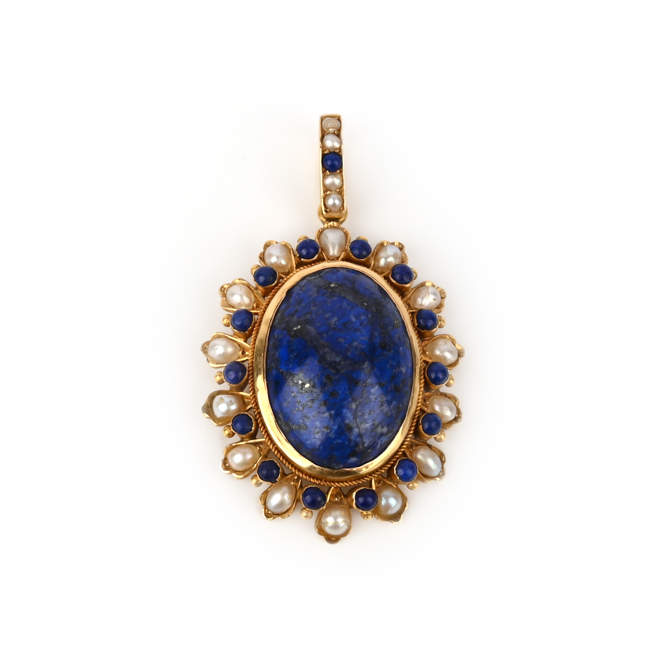 A lapis lazuli and pearl pendant, late 19th century, designed as a cabochon of lapis lazuli within a border of smaller lapis lazuli cabochons and half pearls, the bail similarly set, length 5.4cm including bail, pearls untested