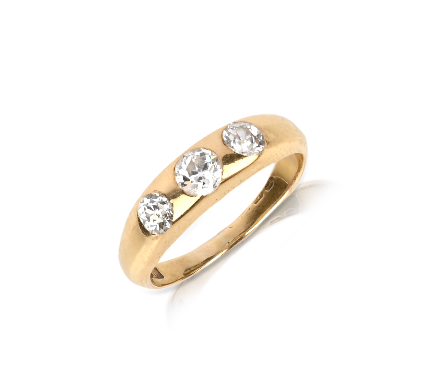 A diamond gypsy ring, mounted in yellow gold, rubover-set with three circular-cut diamonds, size L, sponsor's mark WM
