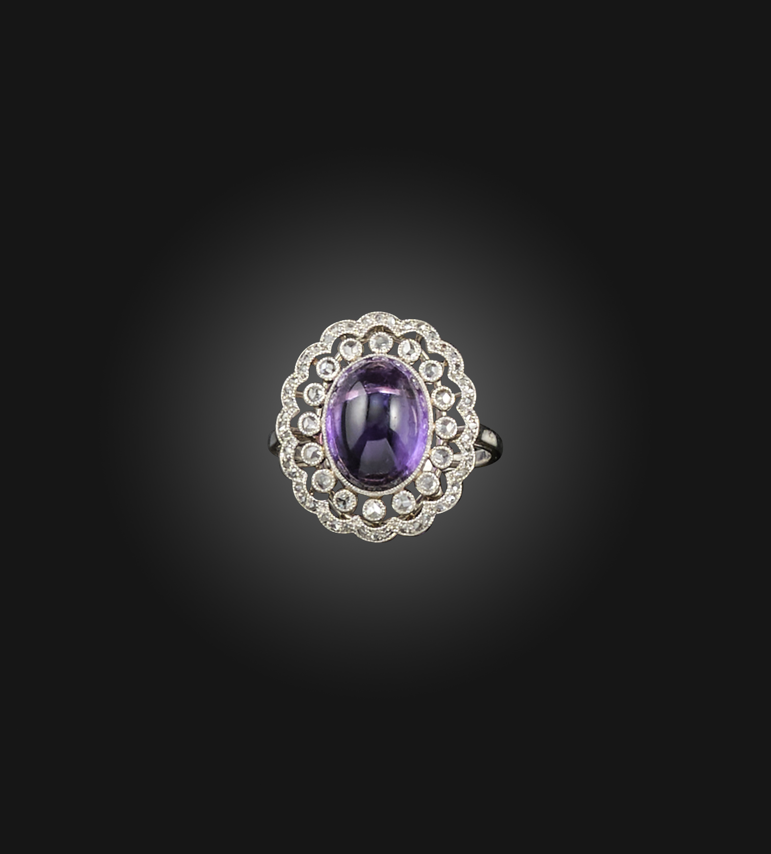 An amethyst and diamond ring, early 20th century, designed as a cabochon amethyst within an open work millegrain-borderd cluster set with rose-cut diamonds, mounted in platinum, size M1/2
