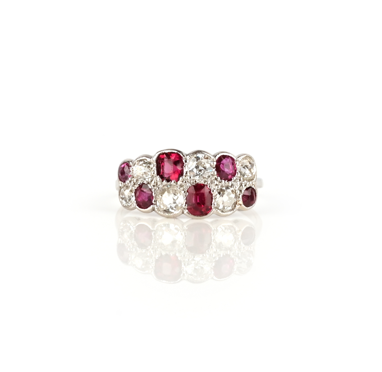 A ruby and diamond half hoop ring, of chequerboard design set with rubies and diamonds in platinum, size N
