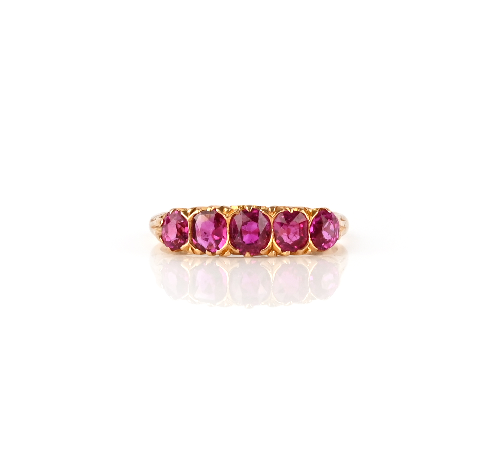 A ruby five-stone ring, late 19th century, set with a series of five graduated cushion-shaped rubies, to a gold shank with scrolled galleries, mounted in 18ct gold, size Q, British hallmarks