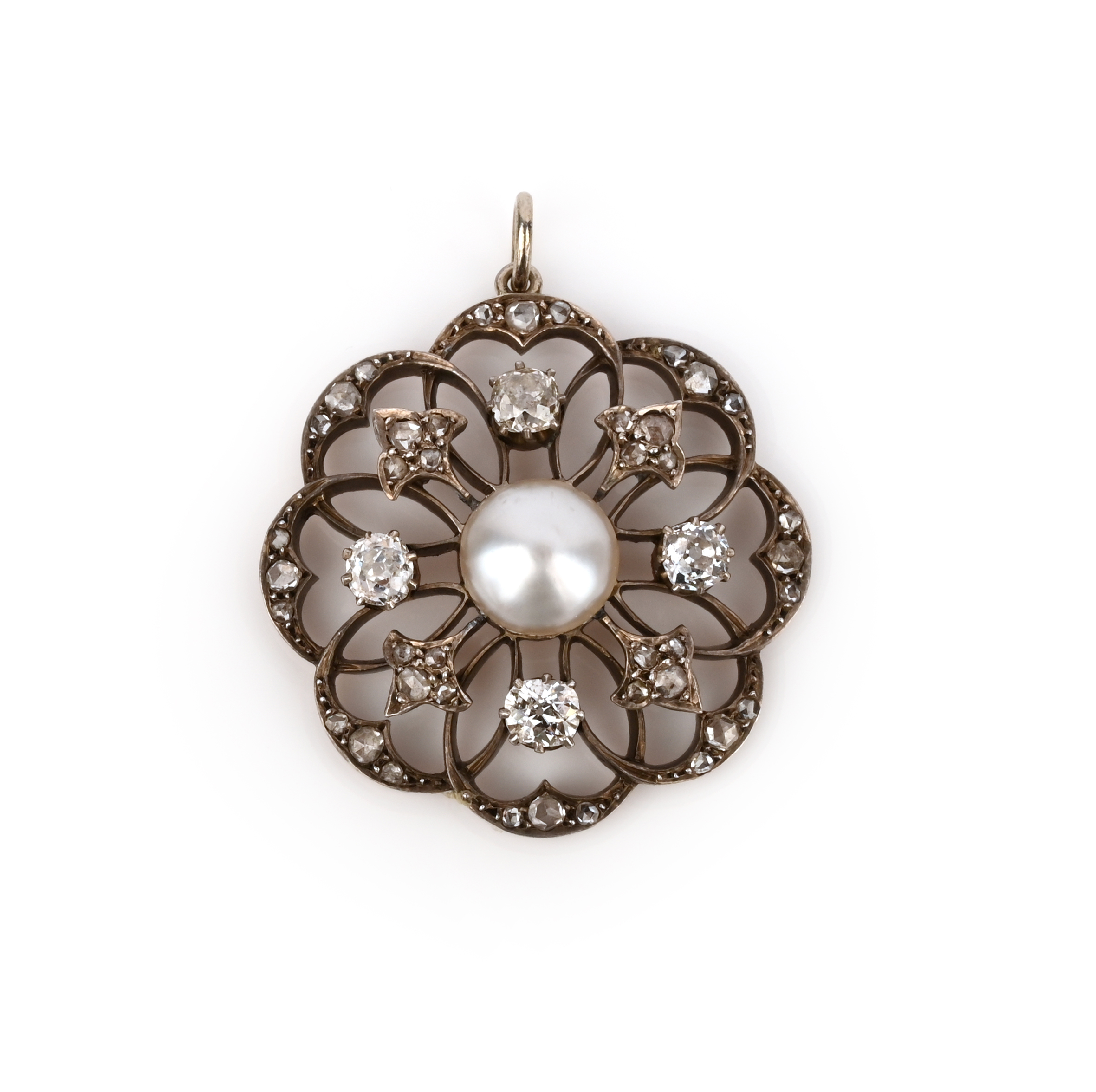 A Victorian pearl and diamond pendant, late 19th century, centring on a bouton-shaped pearl measuring approximately 9.2mm, within a mount of open work design set with cushion-shaped and rose-cut diamonds, mounted in silver on gold, length 3.9cm including bail