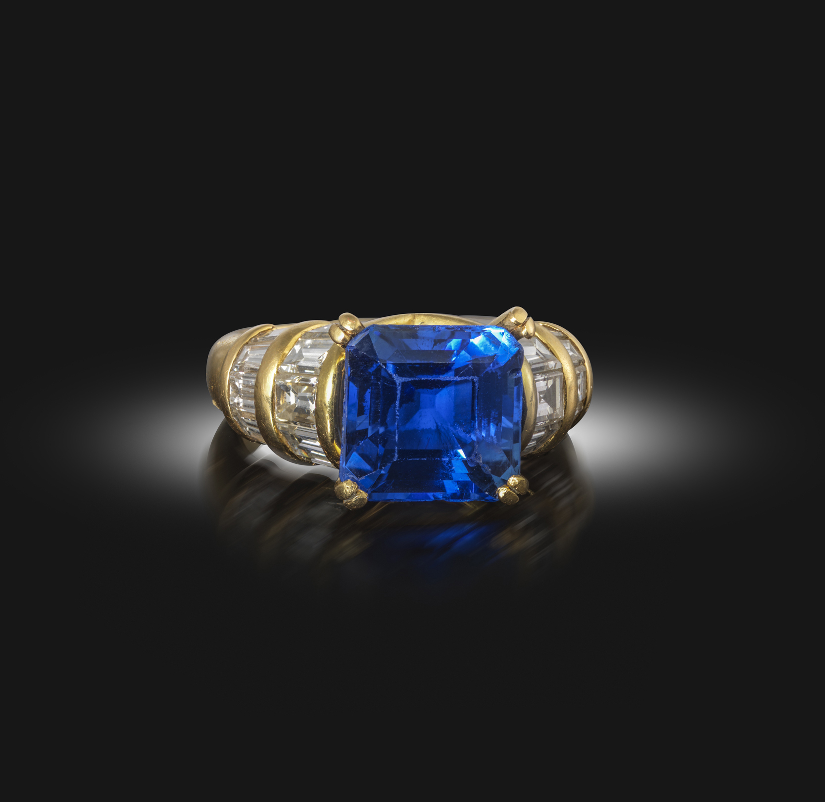 Monture Boucheron, a sapphire and diamond ring, claw-set with an octagonal step-cut sapphire weighing 4.83 carats, to an 18ct yellow gold mount channel-set with square and tapered baguette-cut diamonds, size H1/2 (sizing beads), signed MT Boucheron, numbered P53174, French assay mark for 18ct gold, French maker's mark for Boucheron.
