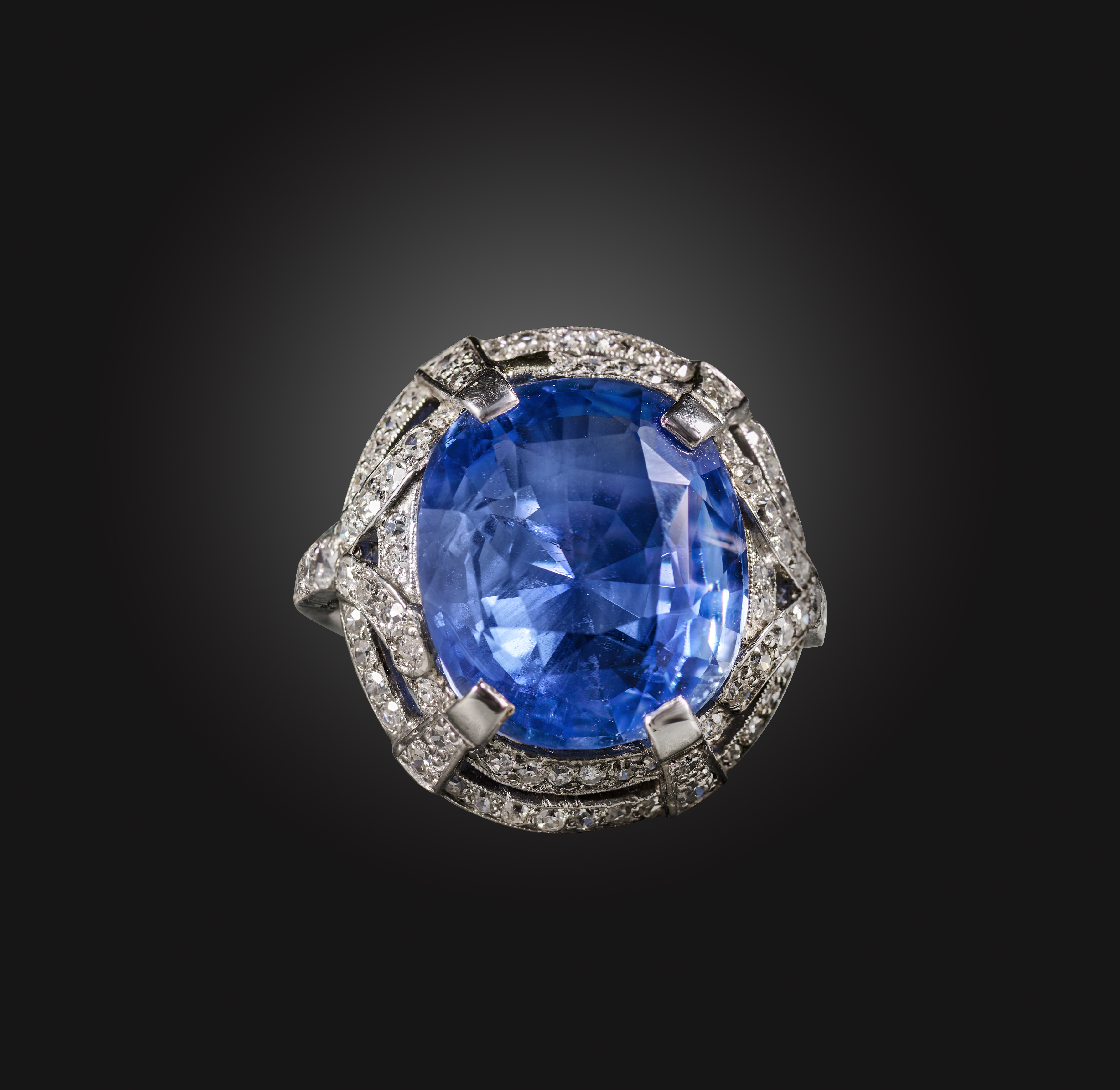 A sapphire and diamond ring, 1920s, claw-set with an oval sapphire weighing 12.97 carats, within a mount of ribbon design set with circular- and single-cut diamonds, the underside pierced with floral motifs, size M 1/2, stamped PLAT