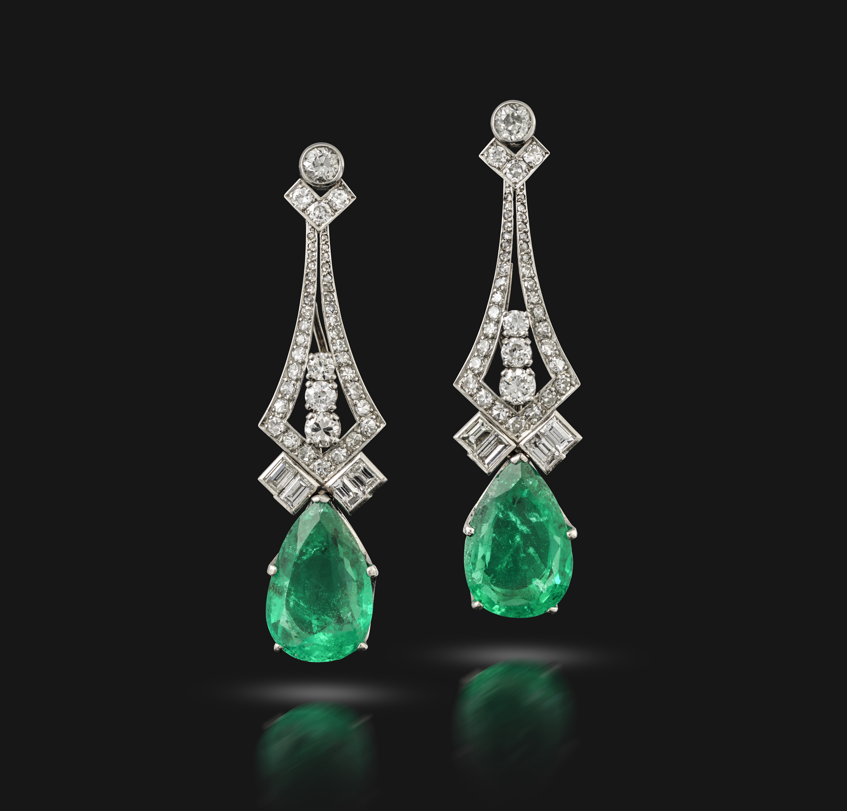 A pair of emerald and diamond earrings, each of drop design, composed of a tapering surmount set with circular-, singe- and rose-cut diamonds, suspending a pear-shaped emerald, post fittings, length 5.2cm each, case