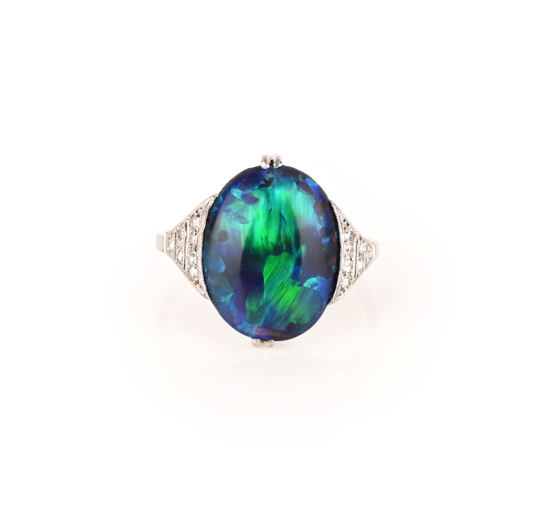 An Art Deco black opal and diamond ring, early 20th century, set with a black opal cabochon, between shoulders millegrain-set with single-cut diamonds, mounted in platinum, size N1/2, stamped Pt