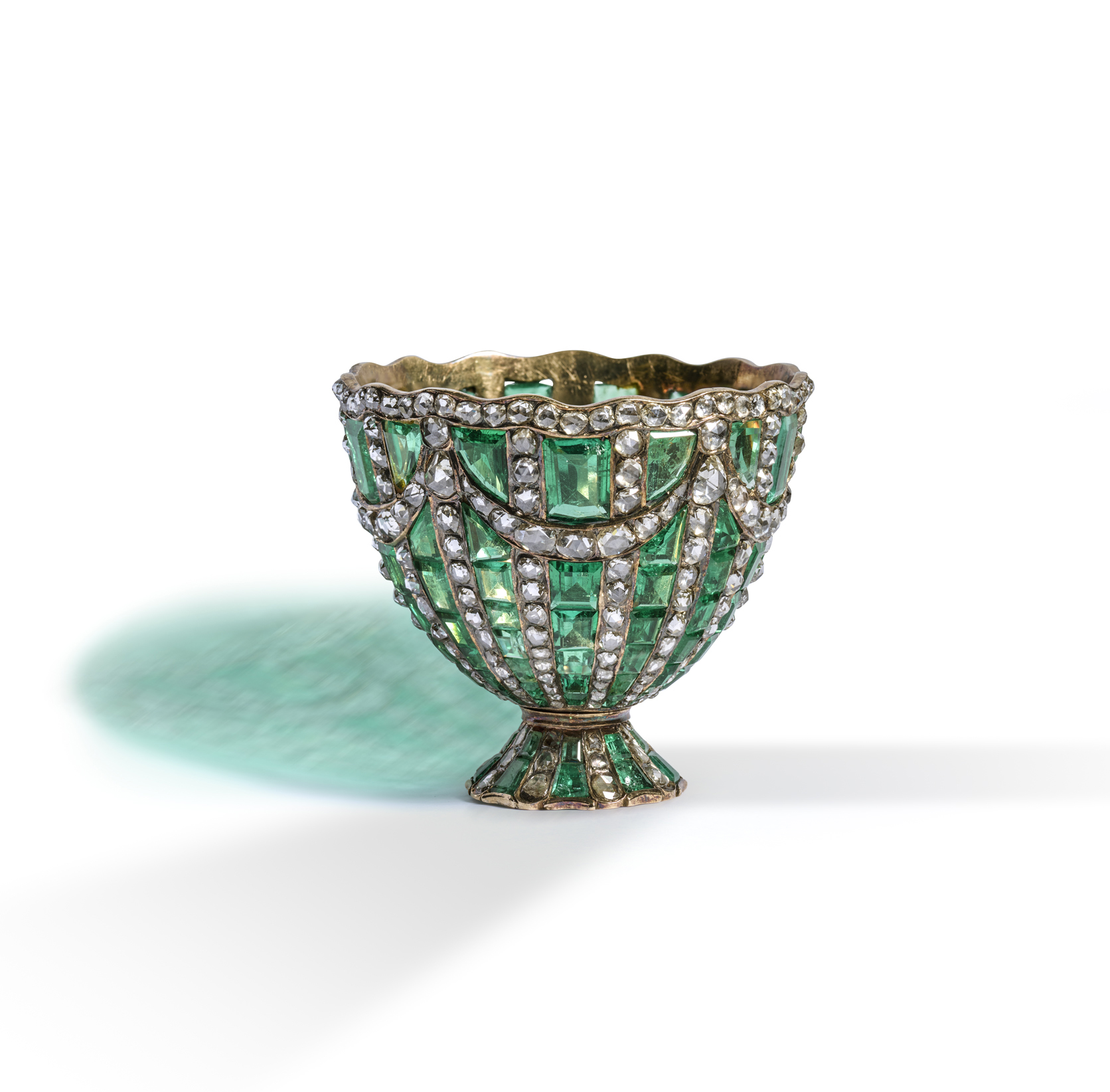 A rare and exceptional emerald and diamond 'zarf' cup, 19th century, the deep cup with undulating rim, to a short spreading foot, channel-set à jour with calibré-cut emeralds and decorated with lines and festoons of pavé-set rose-cut diamonds, mounted in gold, height approximately 4.5cm, diameter approximately 5cm, foot detachable, fitted case and outer box stamped Collingwood