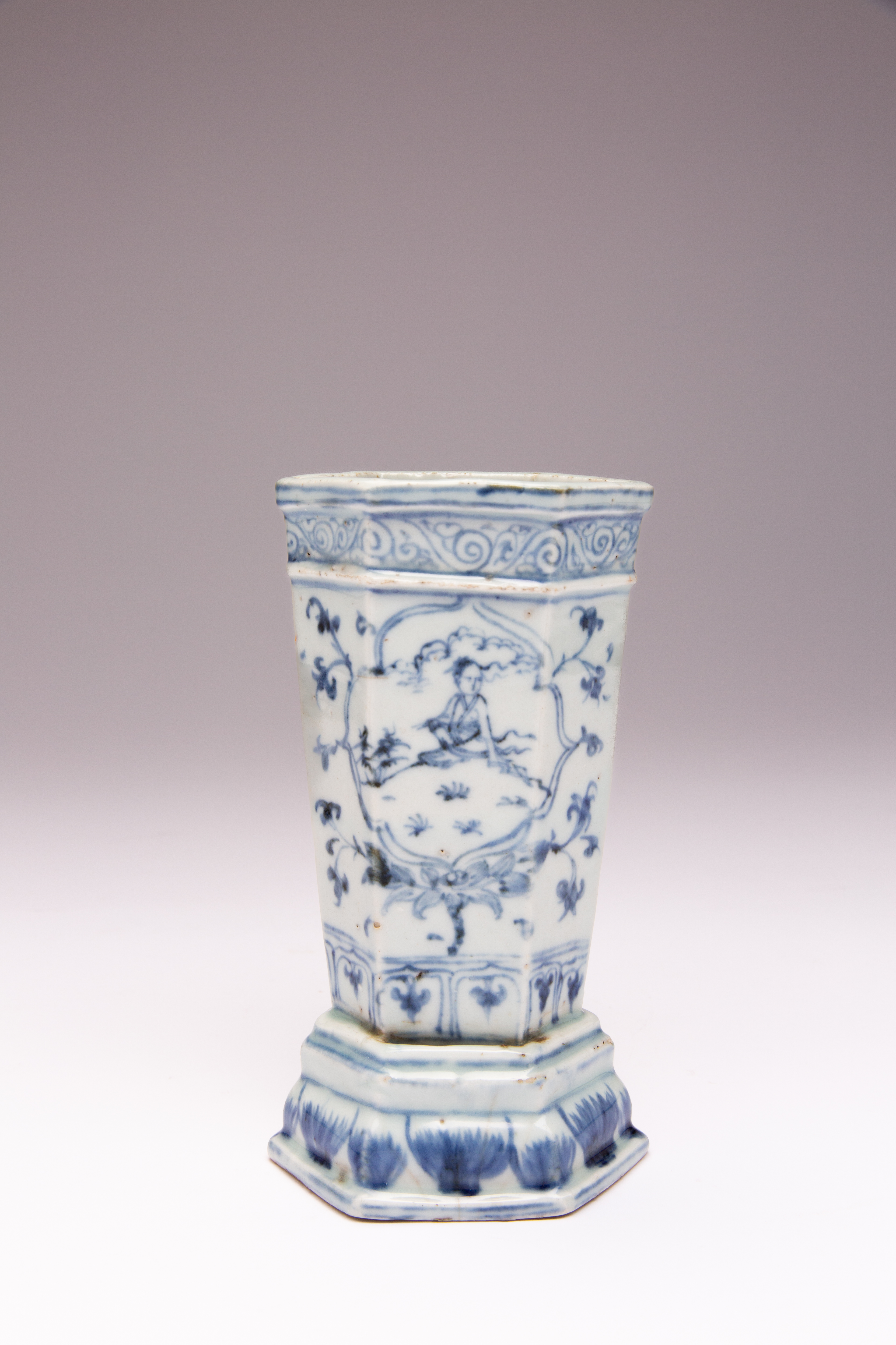 A RARE CHINESE BLUE AND WHITE 'WINDSWEPT' HEXAGONAL INCENSE HOLDER