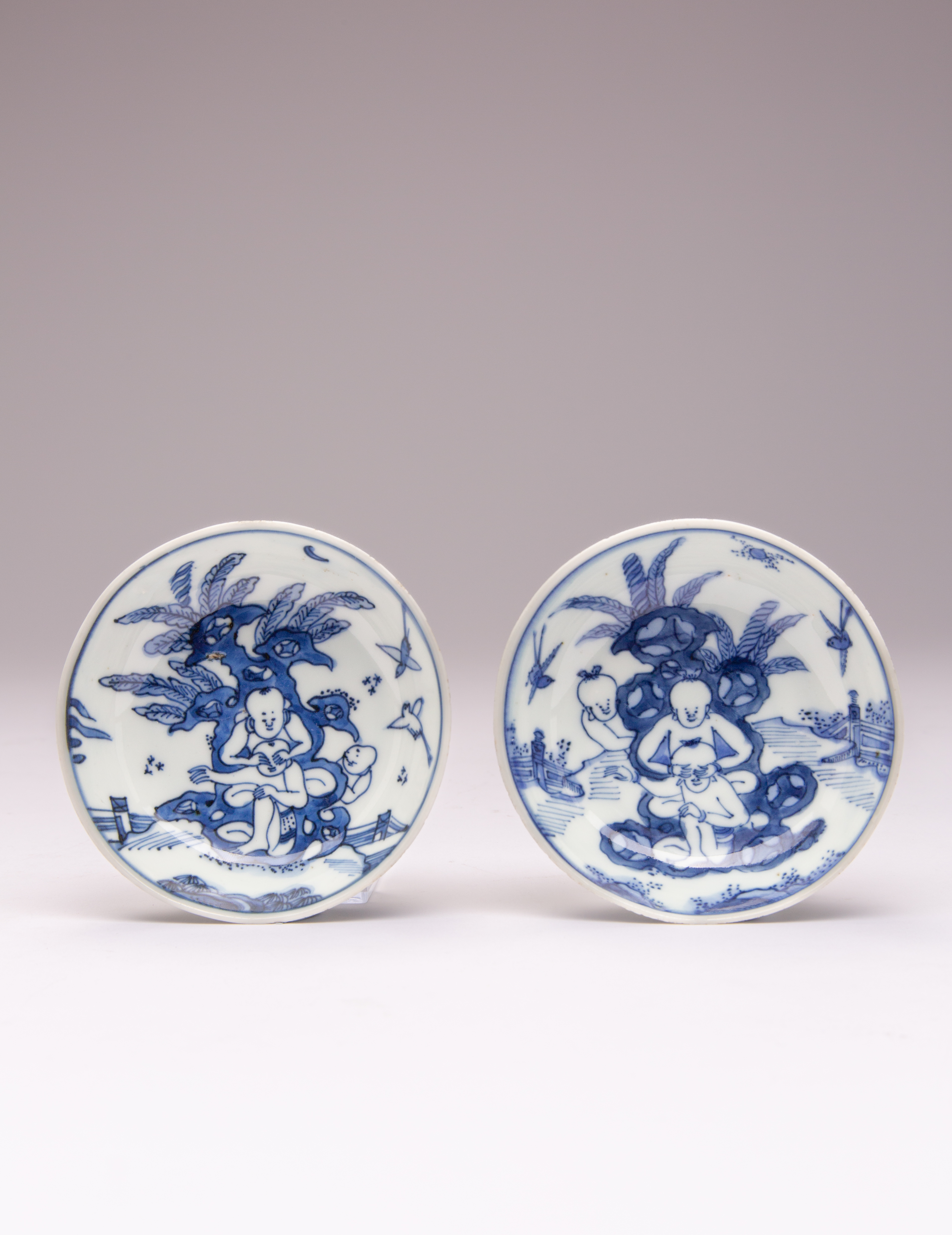 A PAIR OF SMALL CHINESE BLUE AND WHITE 'BOYS' DISHES