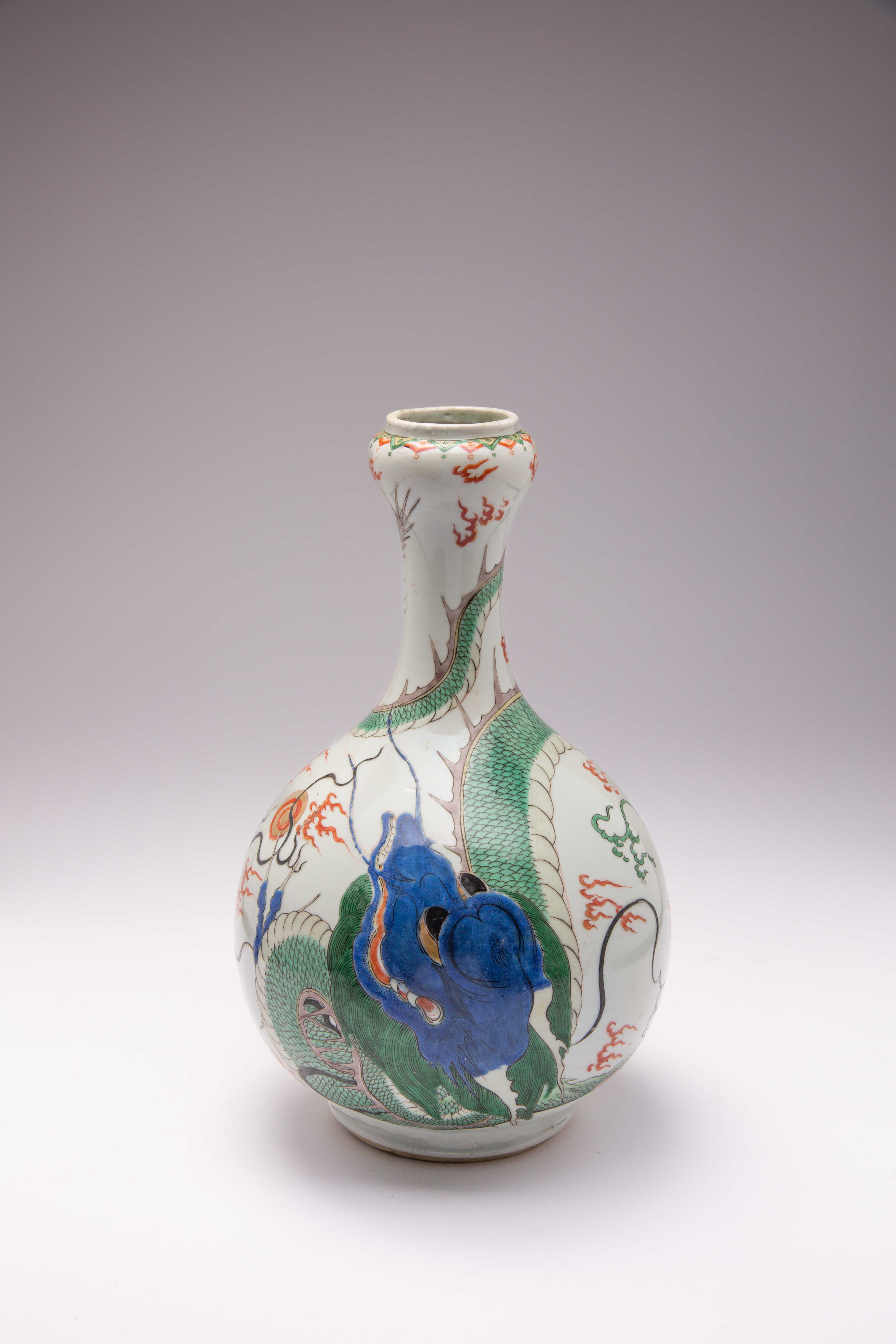 A RARE CHINESE WUCAI GARLIC-MOUTH 'DRAGON' BOTTLE VASE