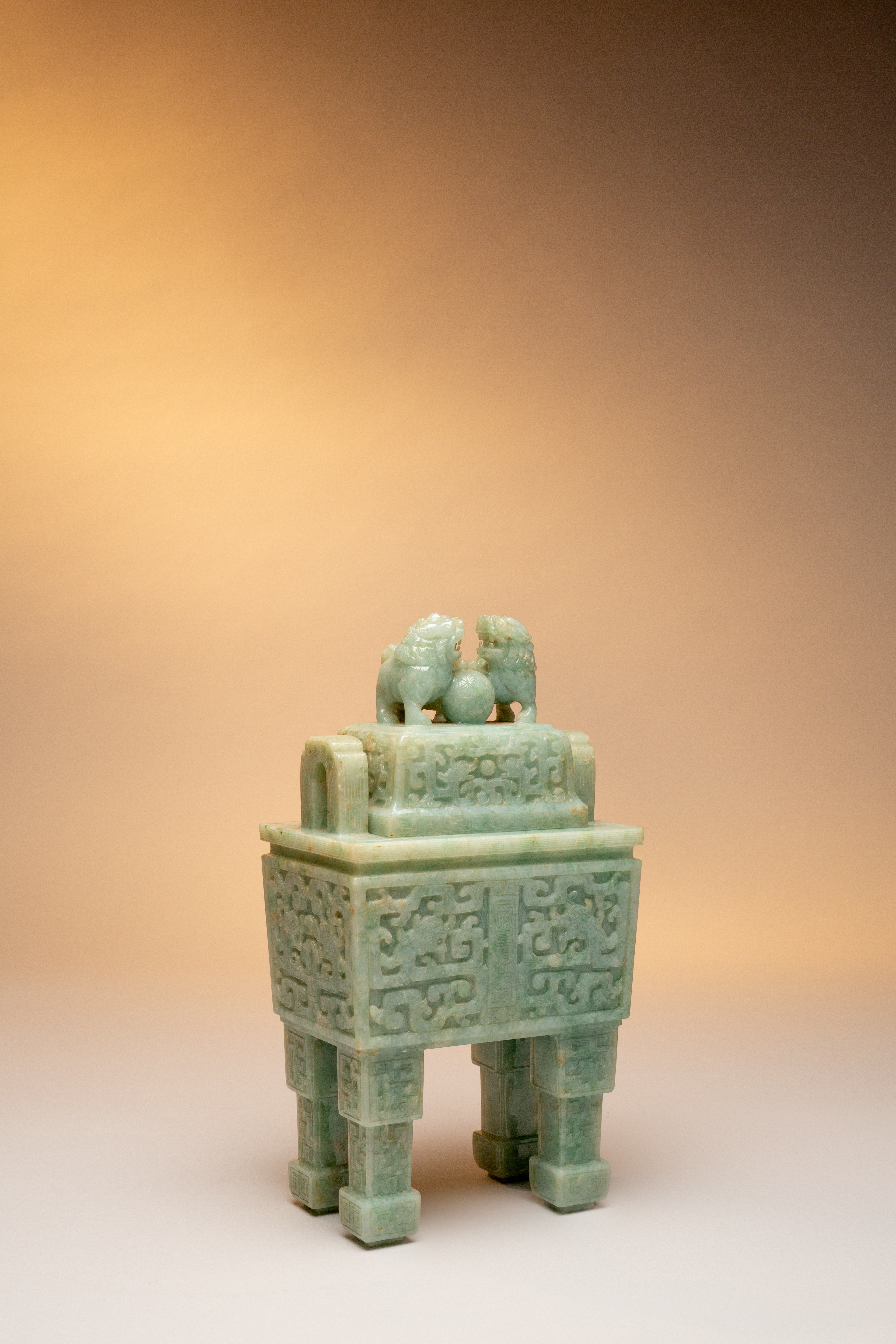 The rectangular body carved in relief with stylised kui dragons, the sides with two panels, one inscribed yu lin bao ding, all raised on four tall square-section legs, the base with a four character Qianlong mark, the cover with two Buddhist lion dogs and a puppy, the stone of an even pale mottled green colour, 29cm. (2)