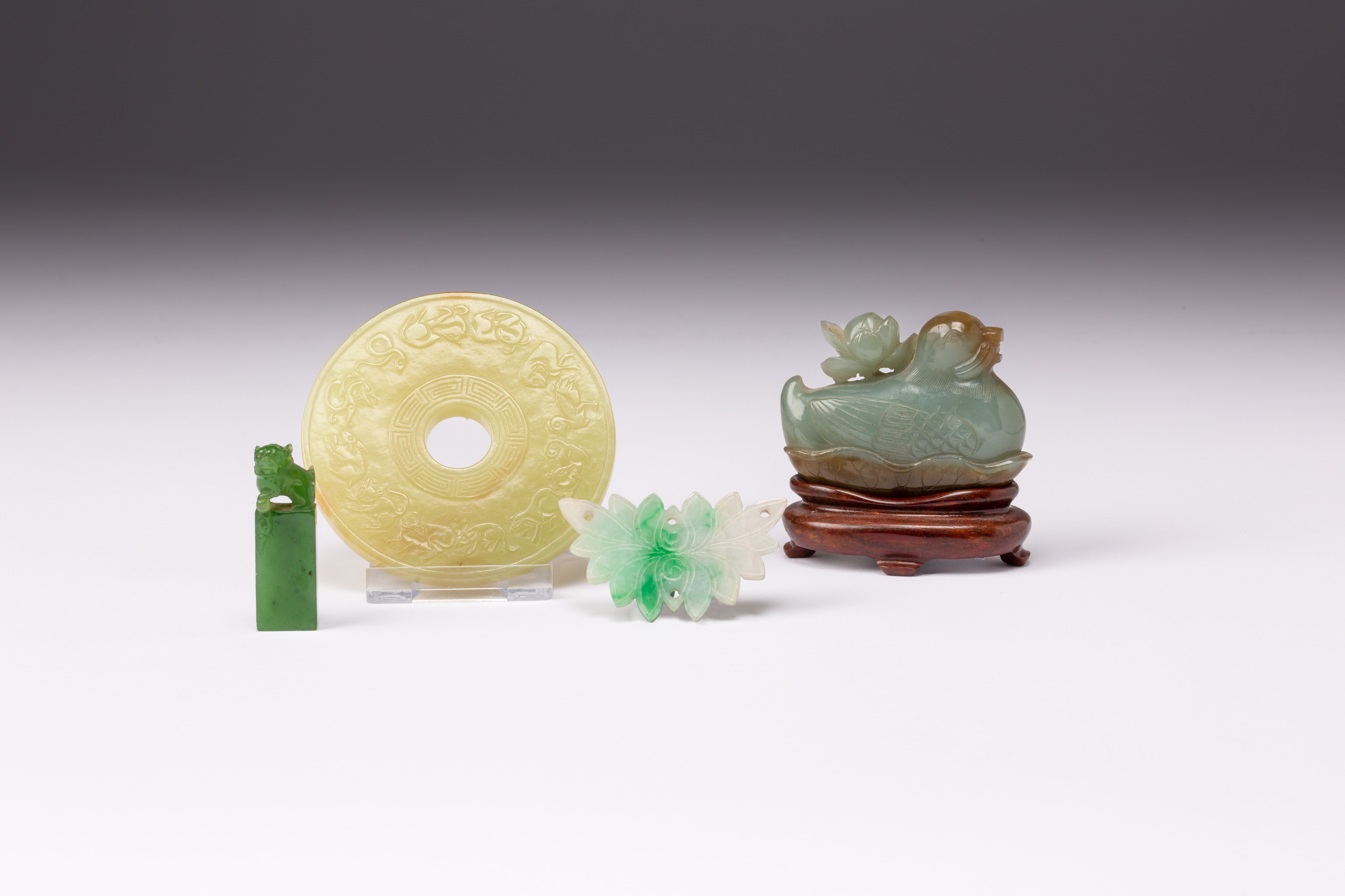The bi carved with the zodiac animals and the eight trigrams, the mandarin duck on a lotus leaf, a pendant carved with lotus, and an uncut seal with a lion dog finial, one with a wood stand, 7cm. (5)