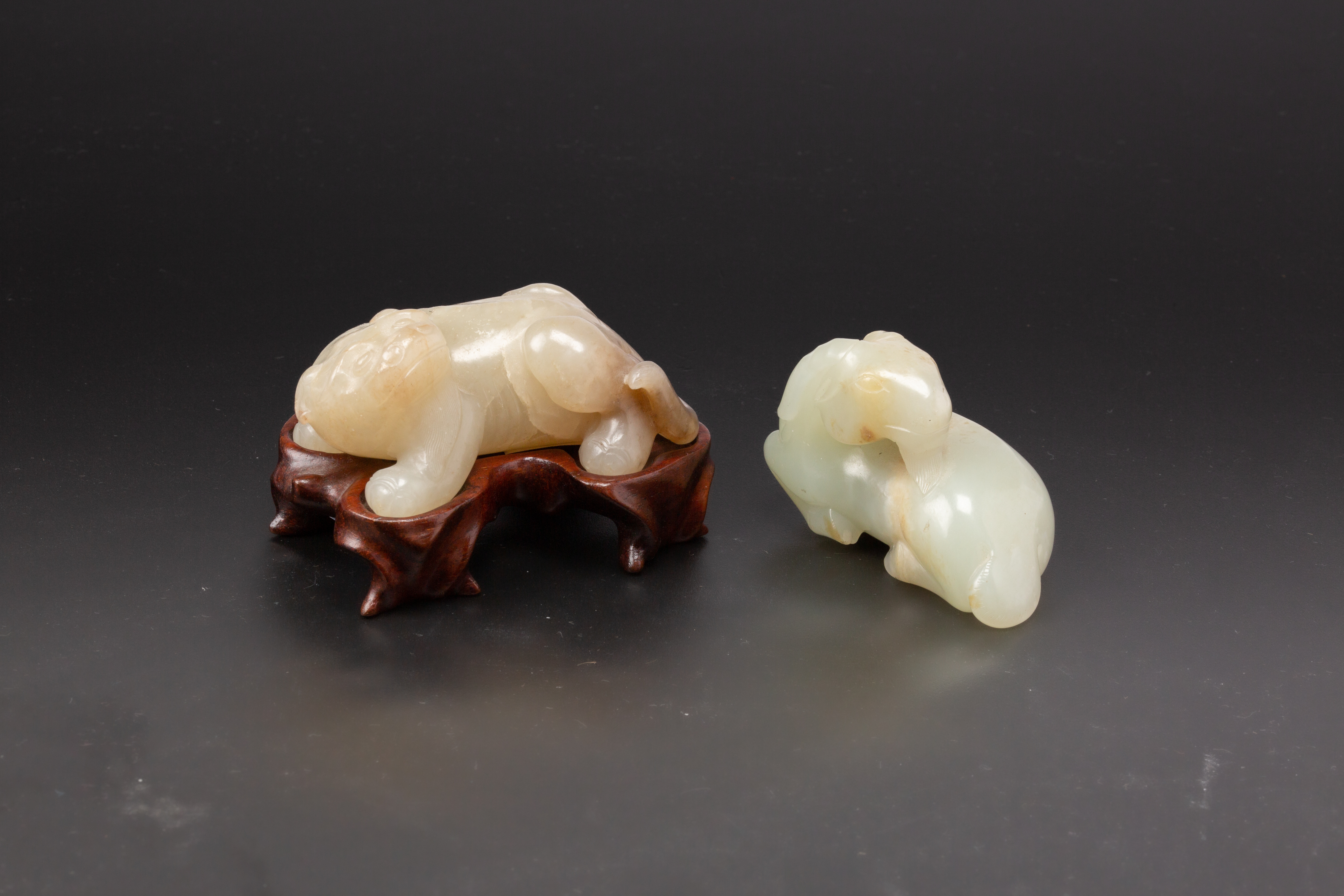 TWO CHINESE CELADON JADE CARVINGS OF RECUMBENT ANIMALS