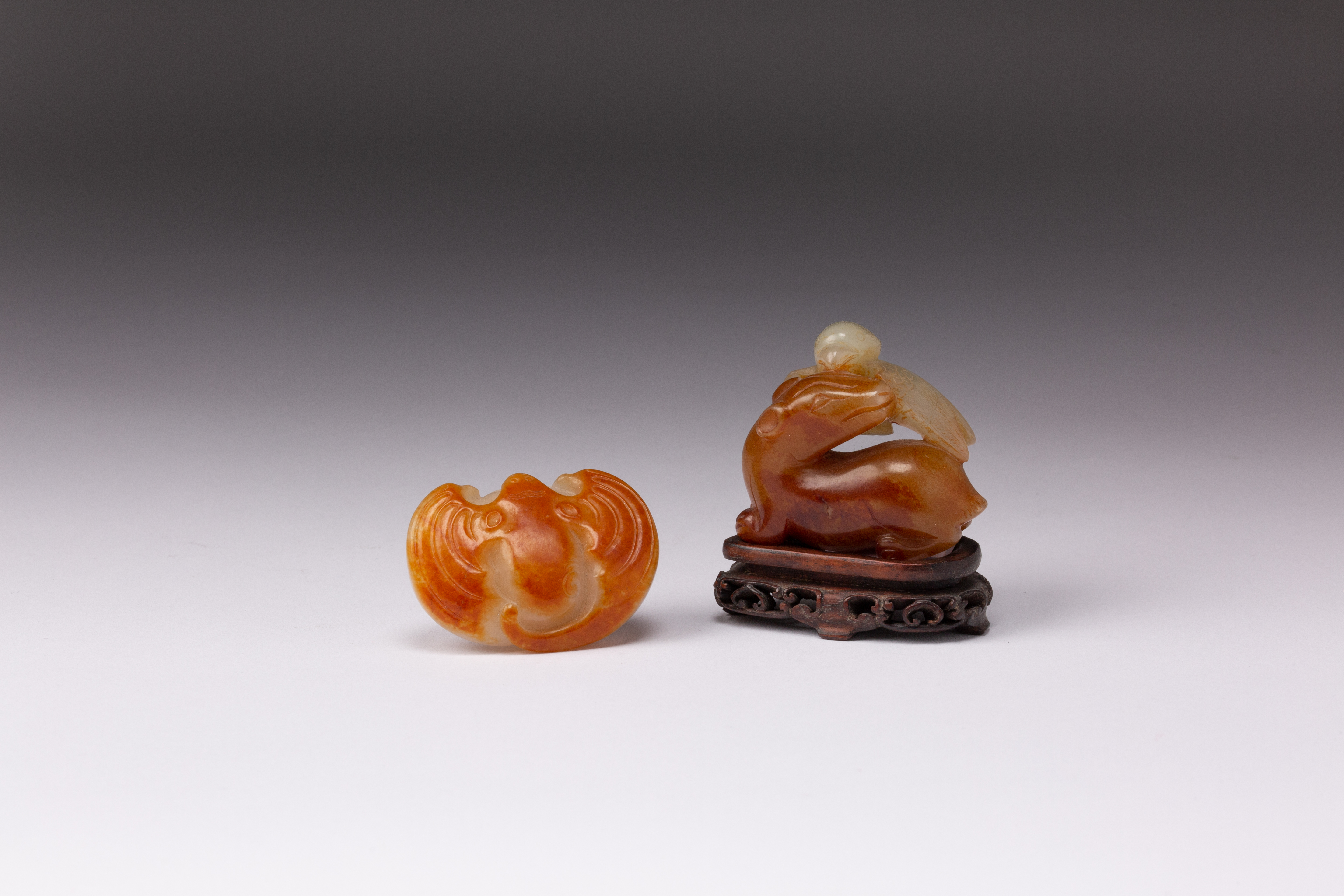 One carved as a recumbent beast with a bird picked out in celadon, the other depicting a peach in white stone, with a bat in russet to the reverse, with a wood stand, 5cm and 4.9cm. (3)
