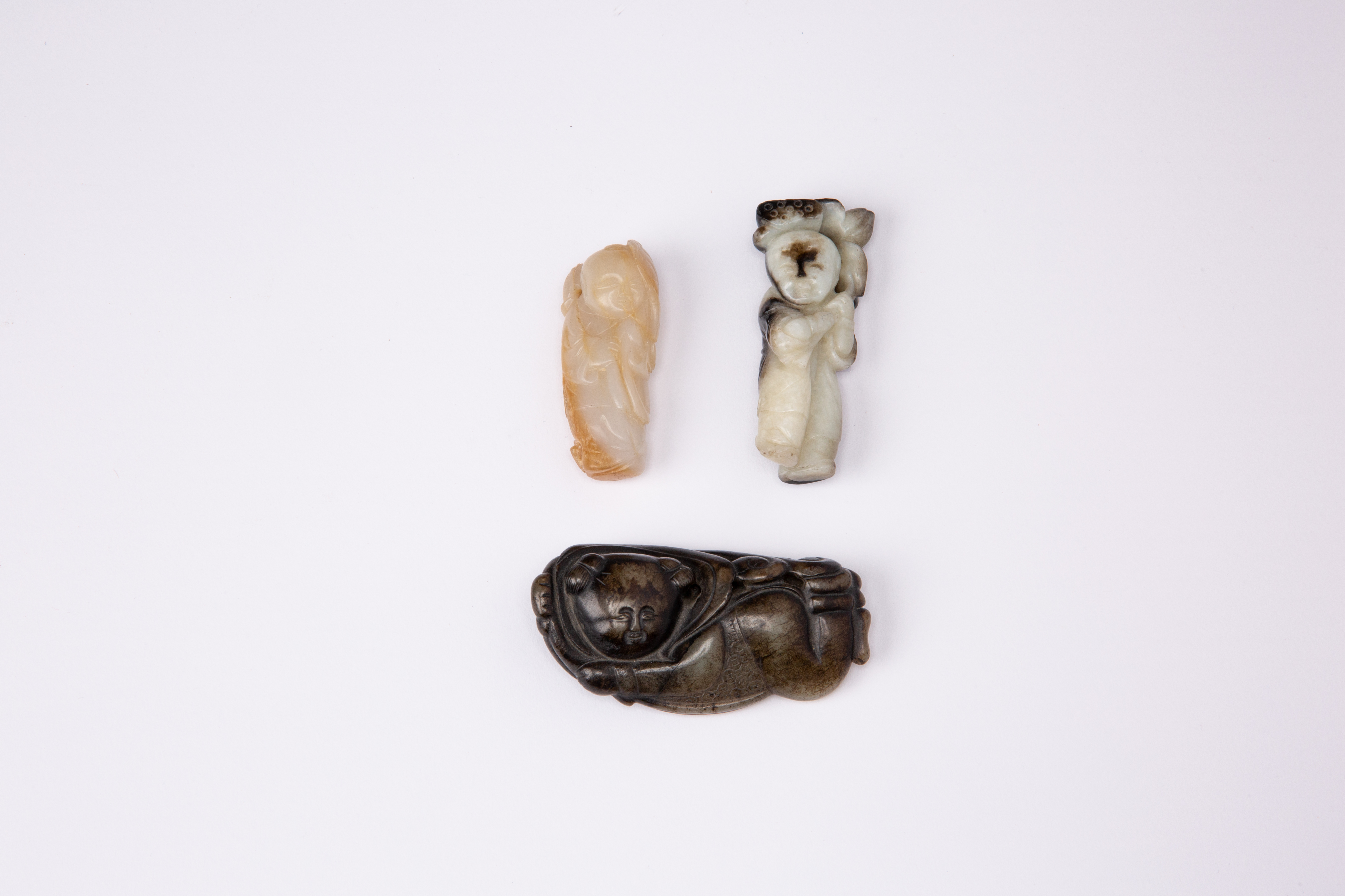 Each depicting a smiling child holding a sprig of lingzhi or lotus, the stones ranging from grey and russet to black, with white mottling and darker markings, 8cm max. (3)